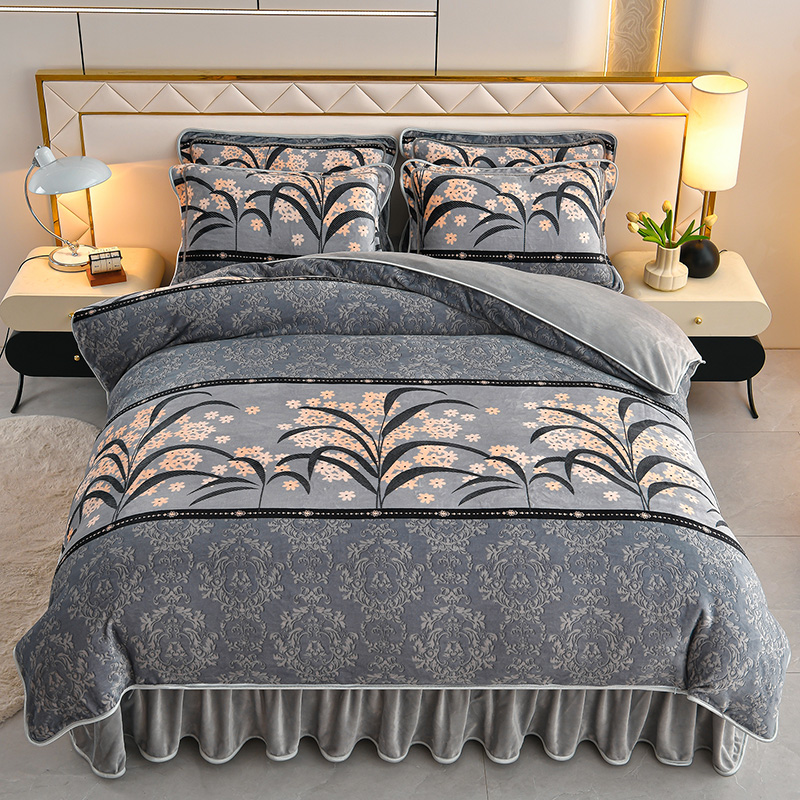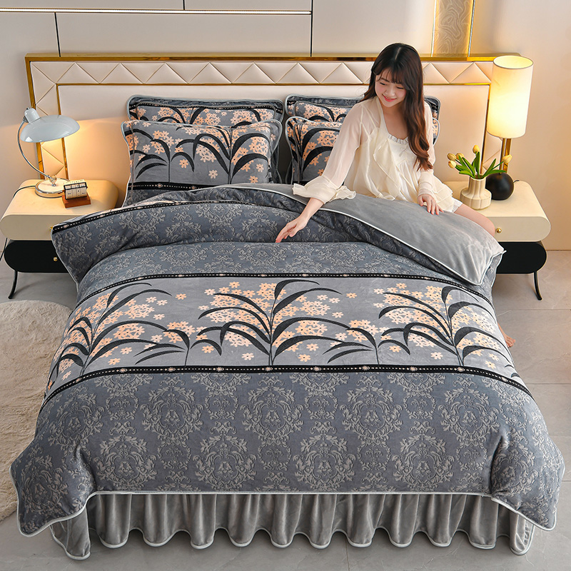 商品名称: 妮恒美 2025新款牛奶绒印花床裙款四件套法莱绒四件套珊瑚金貂绒四件套 五谷丰登