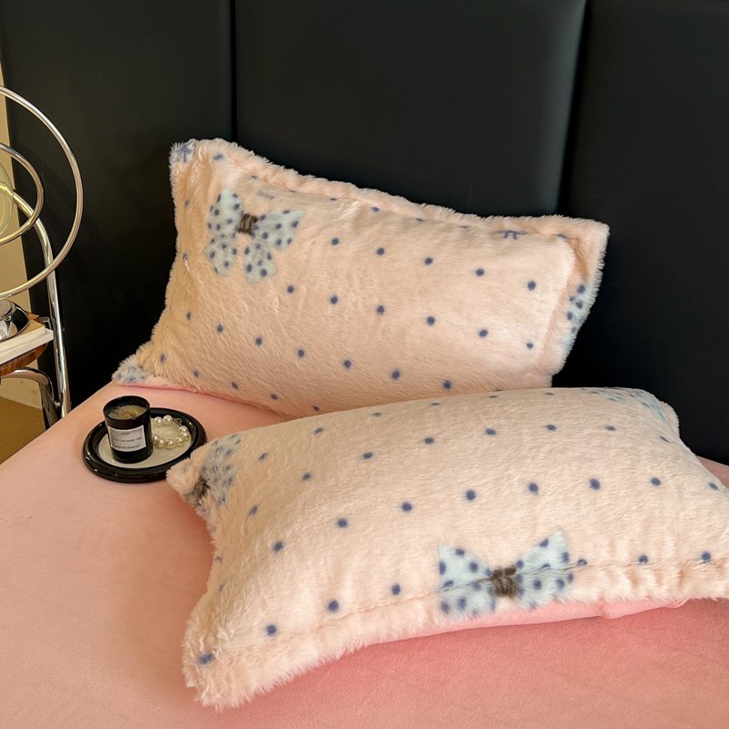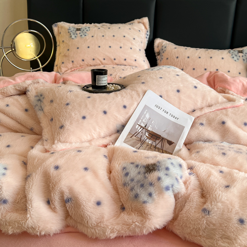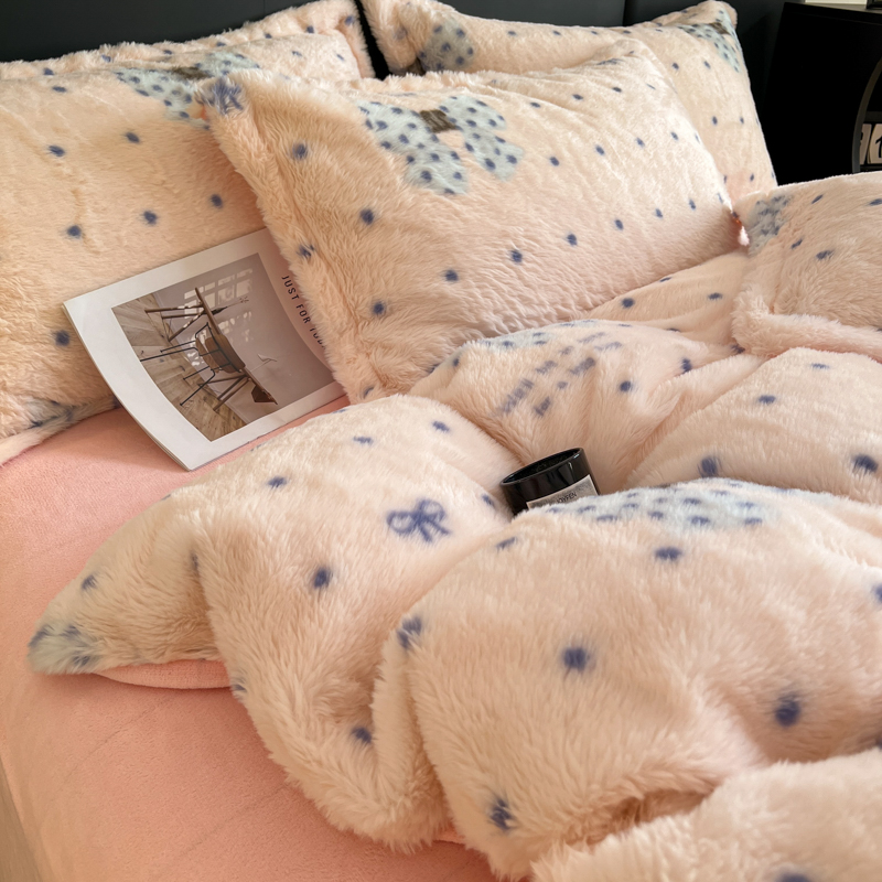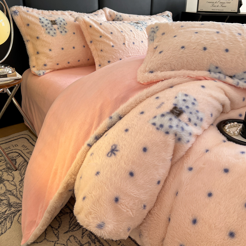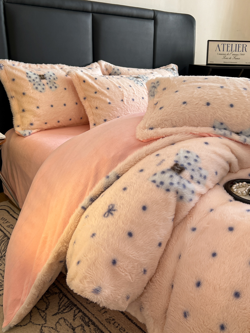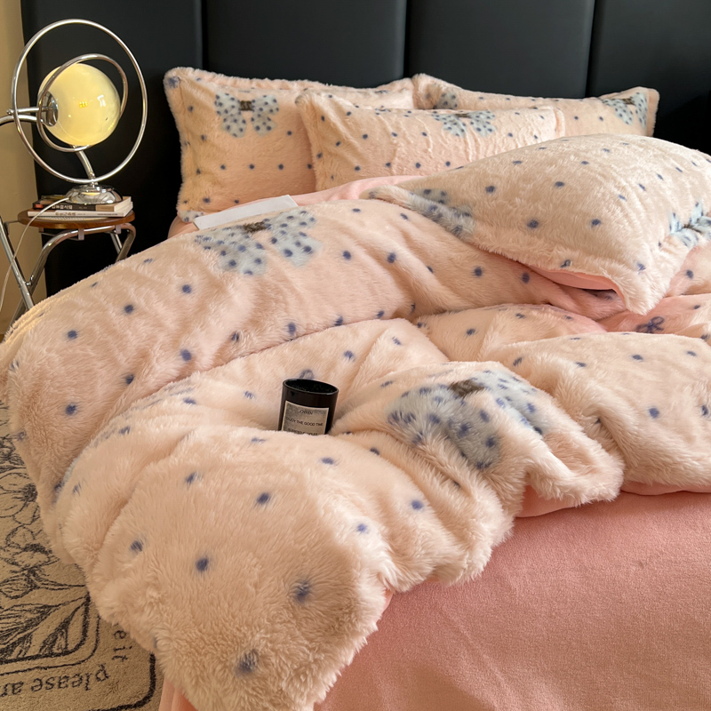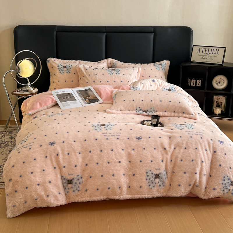 商品名称:一比一家纺 2025新款亲肤舒适兔毛绒兔兔绒牛奶绒四件套 蝴蝶结点点-粉