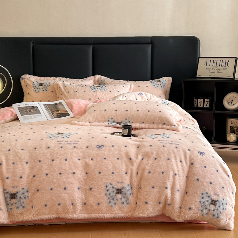 一比一家纺 2025新款亲肤舒适兔毛绒兔兔绒牛奶绒四件套 蝴蝶结点点-粉