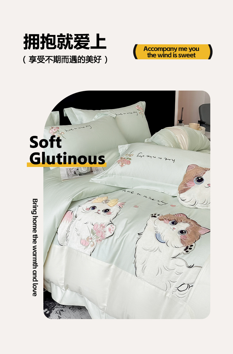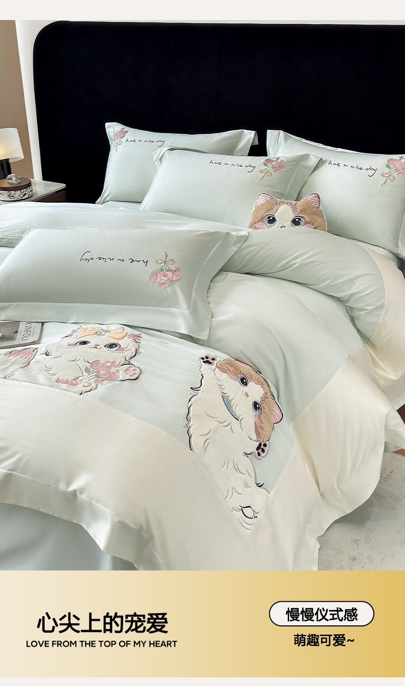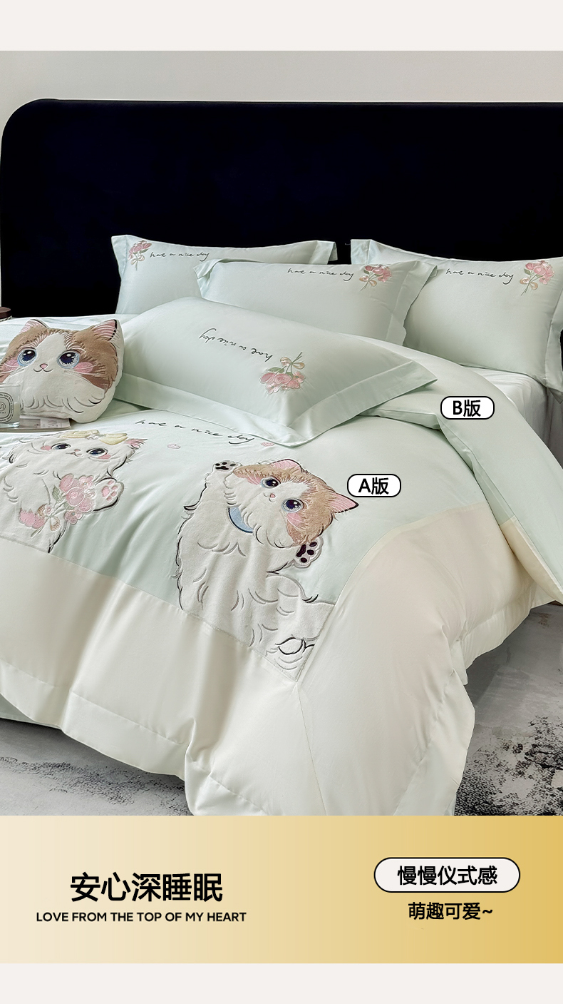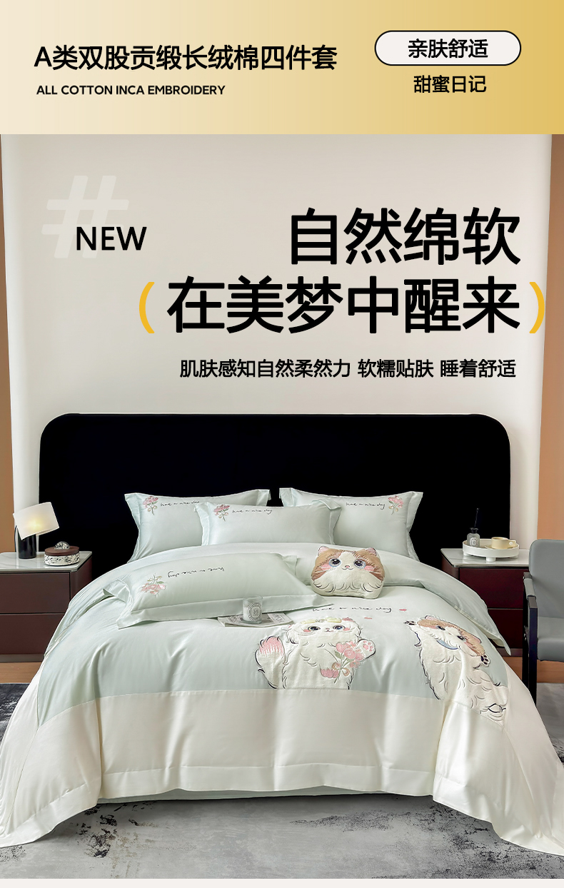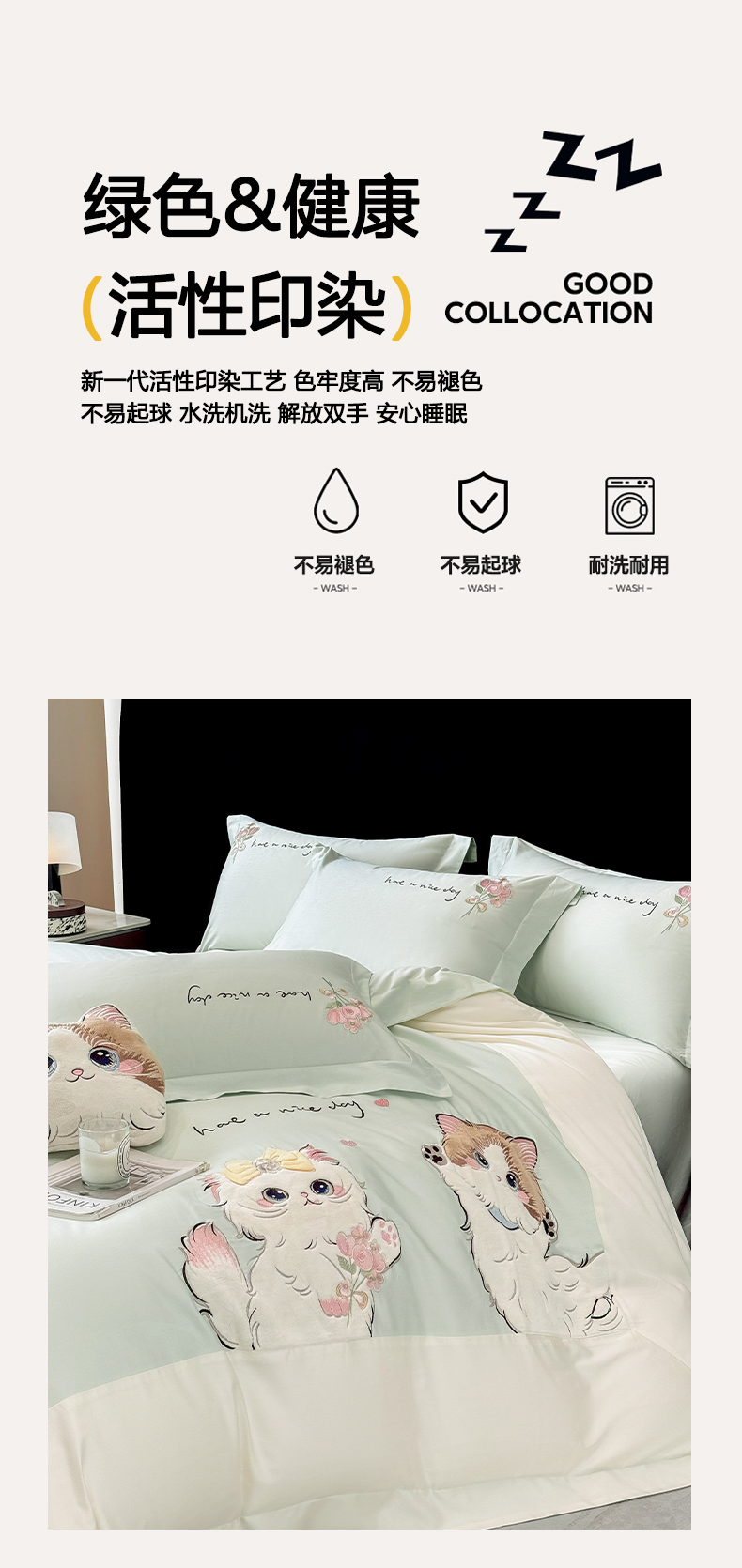 商品名称:丞音家纺 2025新款轻奢卡通风A类50s双股100支贡缎长绒棉四件套刺绣全棉被套绣花床笠高档礼盒装 甜蜜日记-清新绿