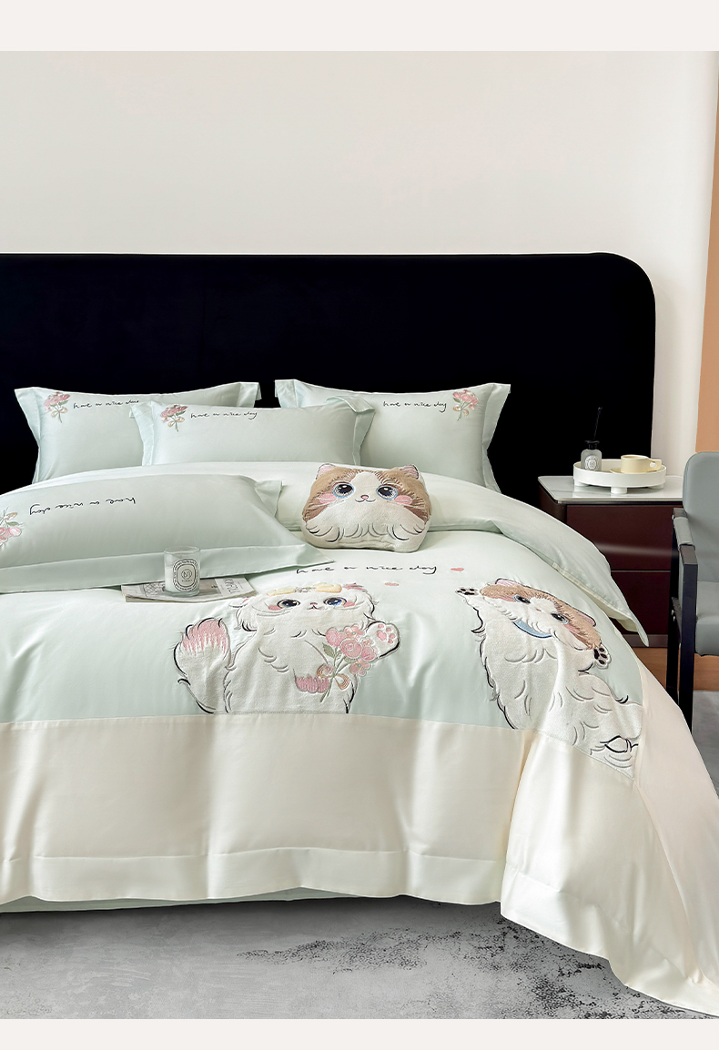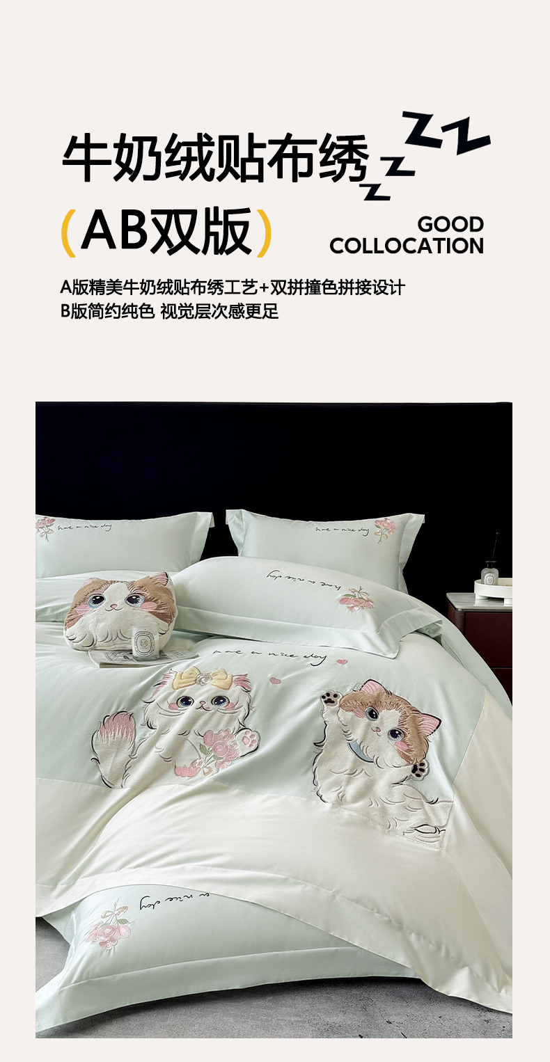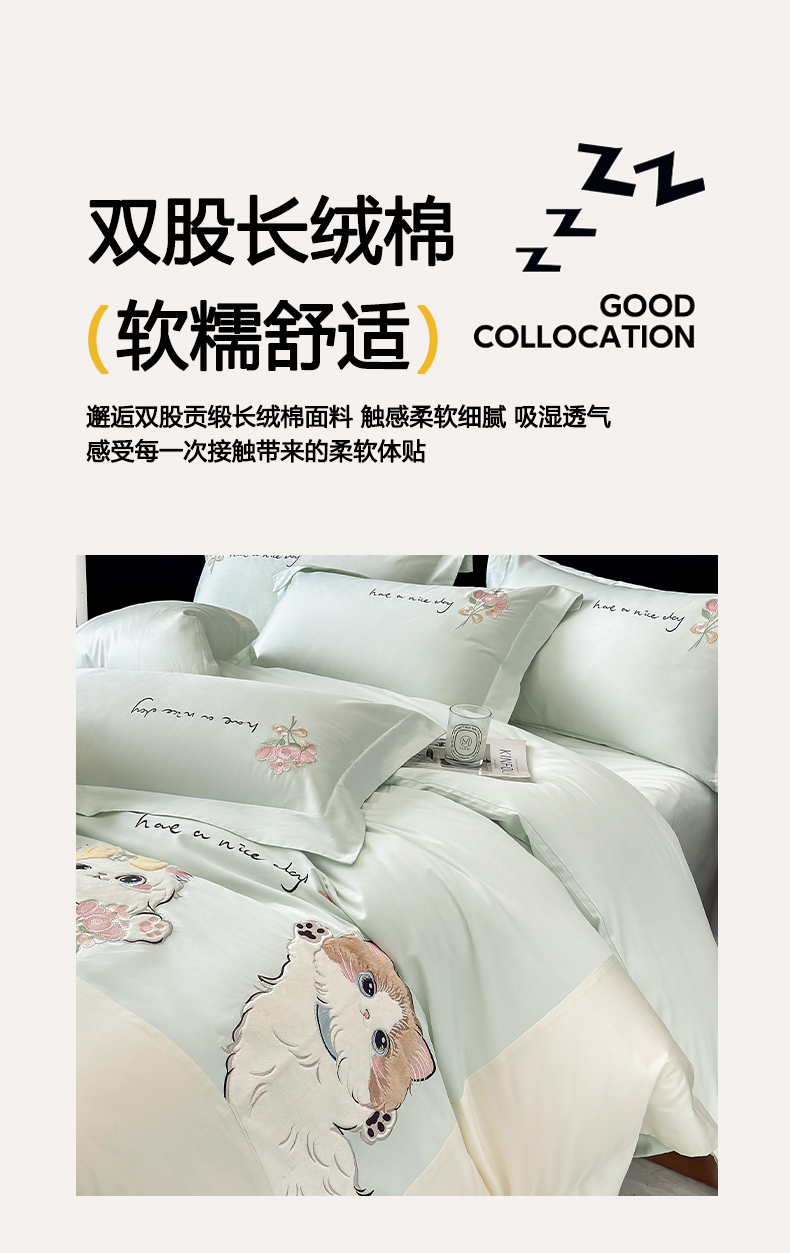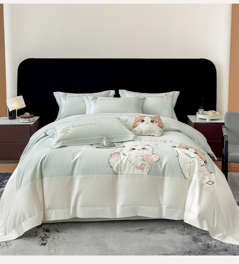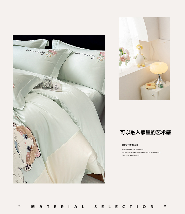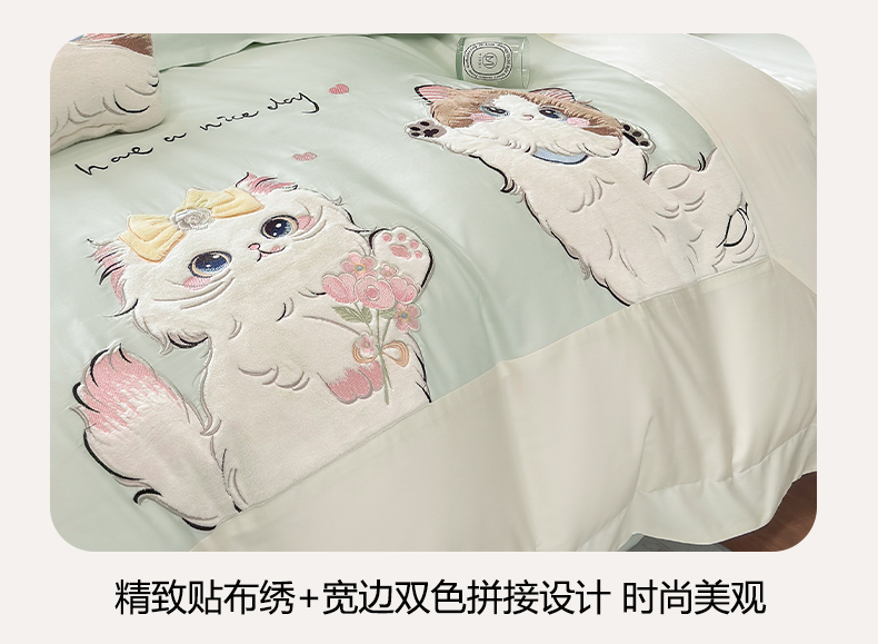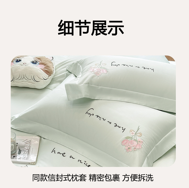商品名称:丞音家纺 2025新款轻奢卡通风A类50s双股100支贡缎长绒棉四件套刺绣全棉被套绣花床笠高档礼盒装 甜蜜日记-清新绿