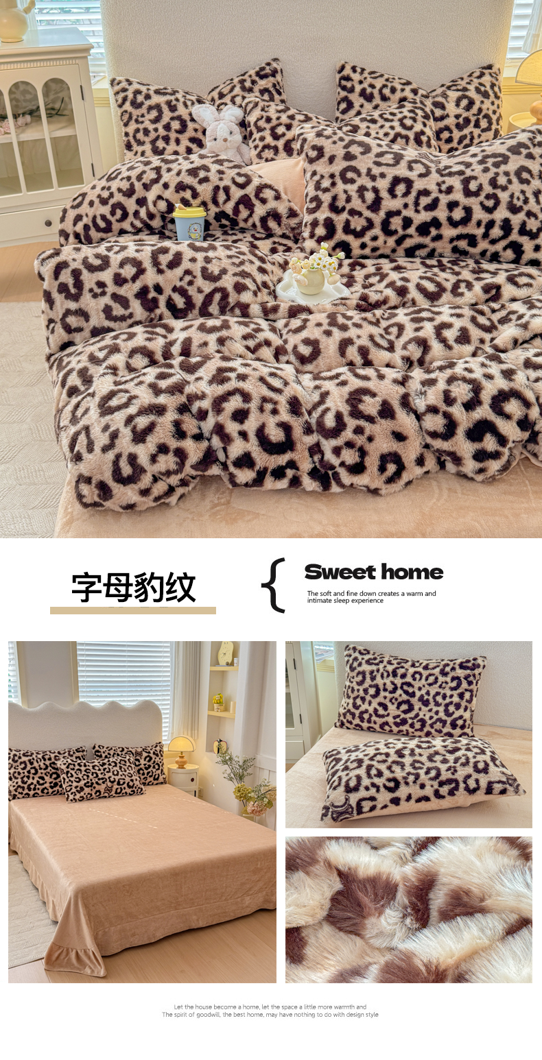 当前位置: 91家纺网 > 商品网购 > 床品套件 > 四件套 > 兔毛绒四件套 > 小叮当家纺仓储工厂店 2025新款印花美拉德兔毛印花四件套 字母豹纹