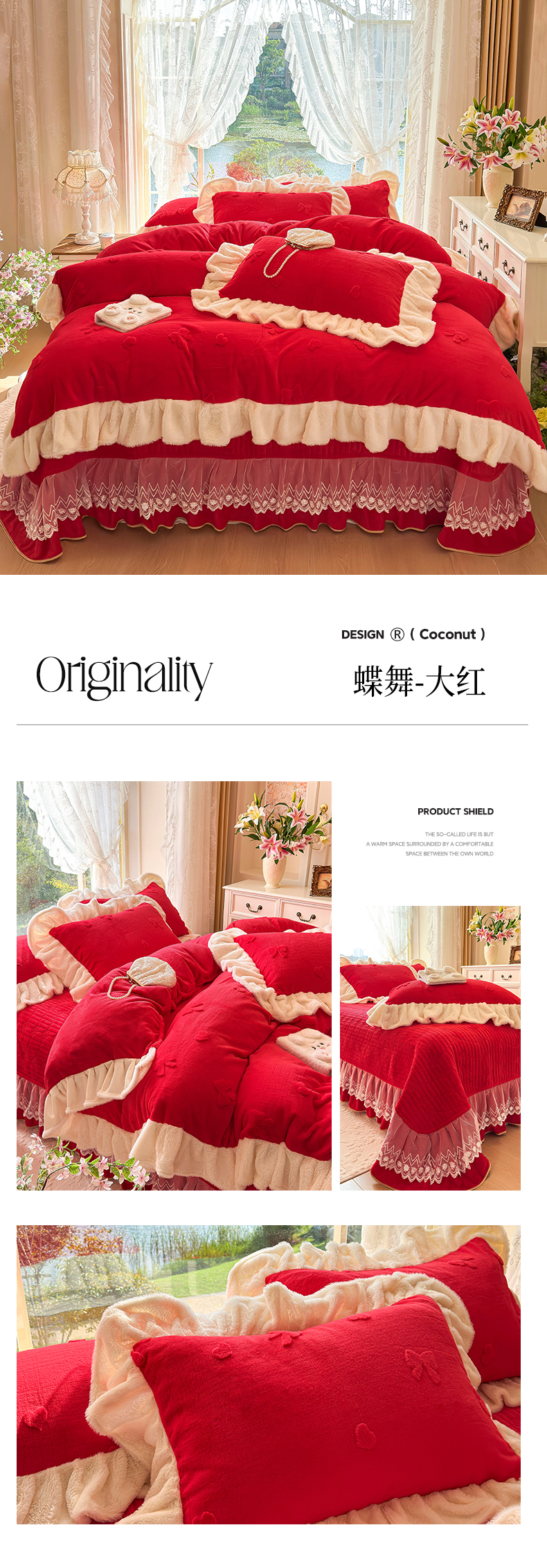 (总)宜凡家纺 2025新款婴儿绒压花全夹棉床裙四件套,韵雅-中国红,韵雅-黑天鹅