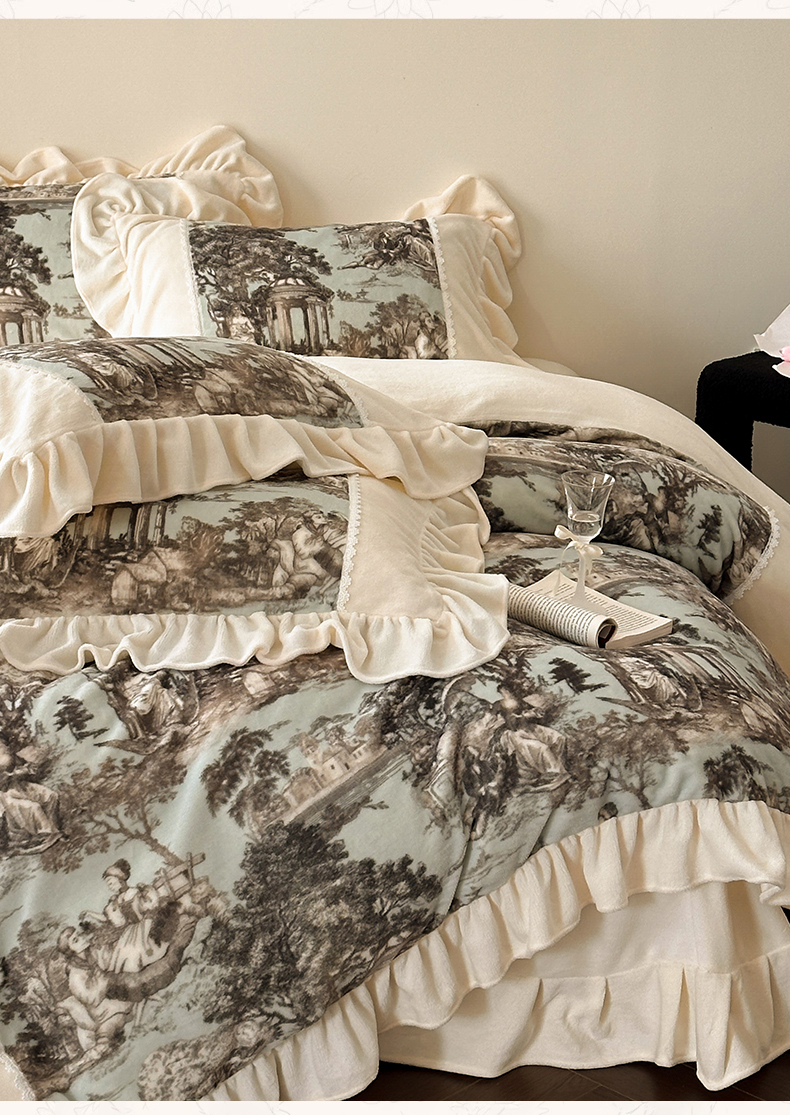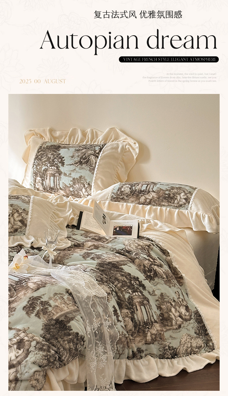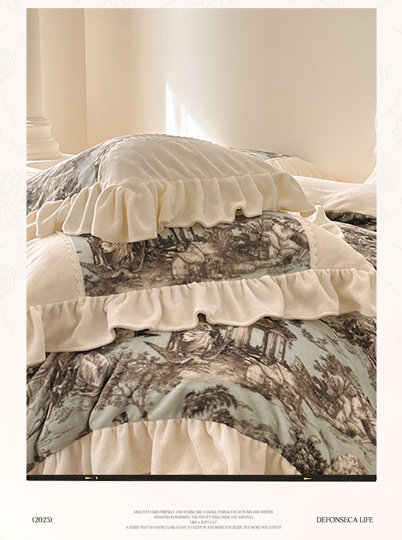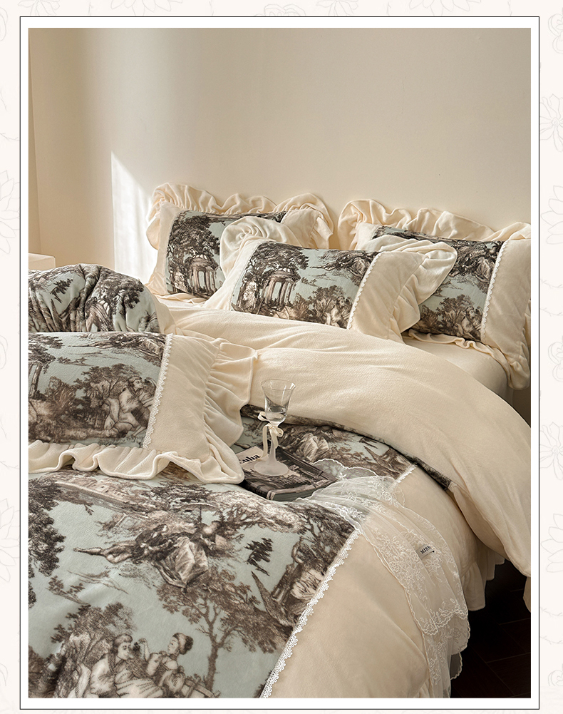 (总)一左一右 2025秋冬新款法式风复古数码印花高克重花边牛奶绒四件套-凯西亚(提供买家秀)