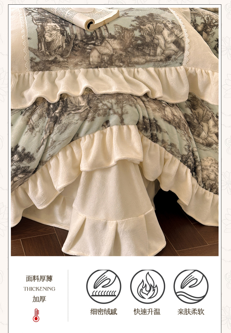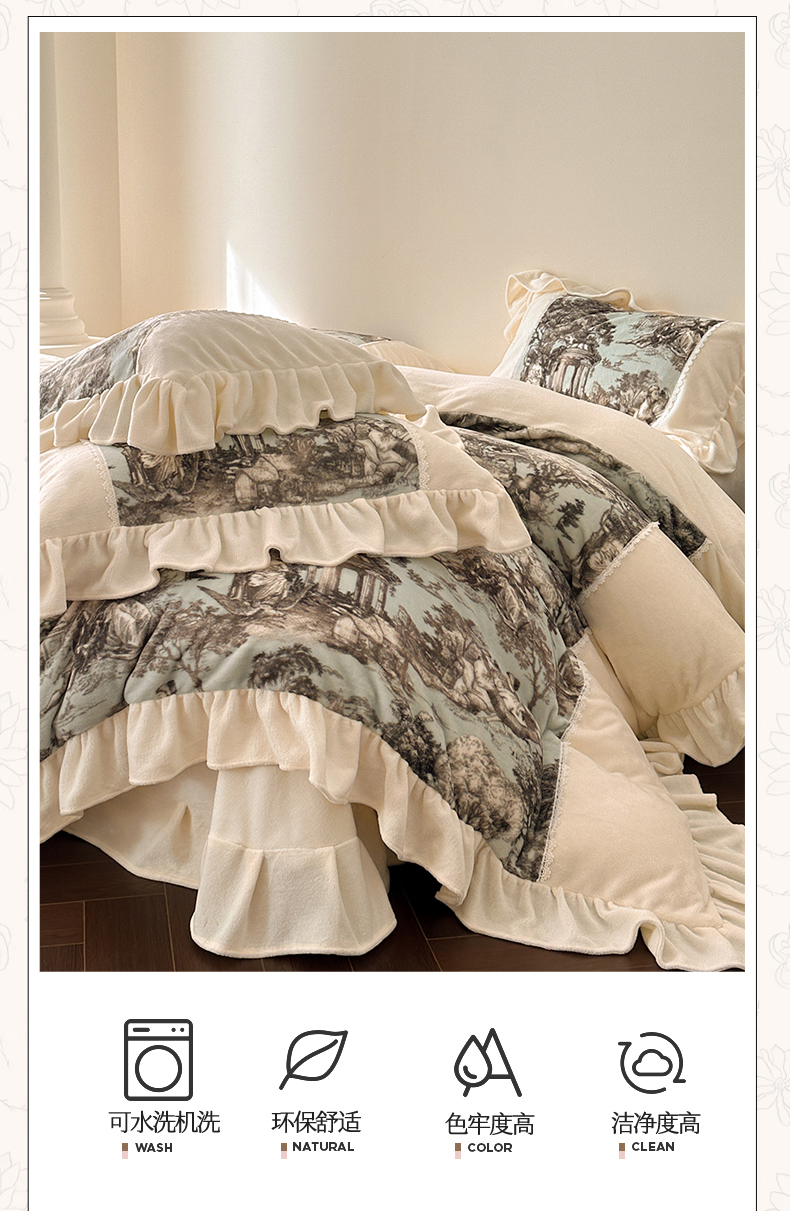(总)一左一右 2024秋冬新款法式风复古印花褶皱花边保暖加厚高克重全消光牛奶绒四件套(提供买家秀),复古绿,奶油白,仲夏粉
