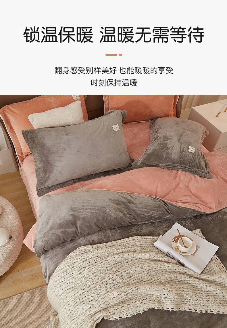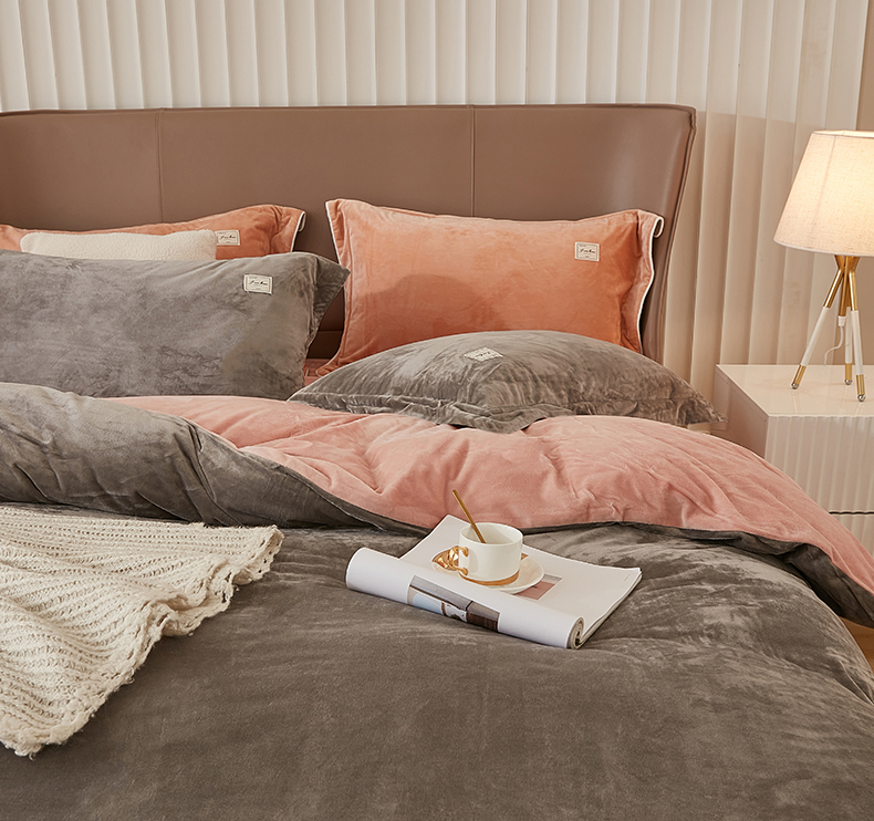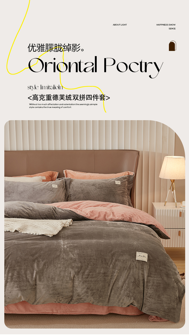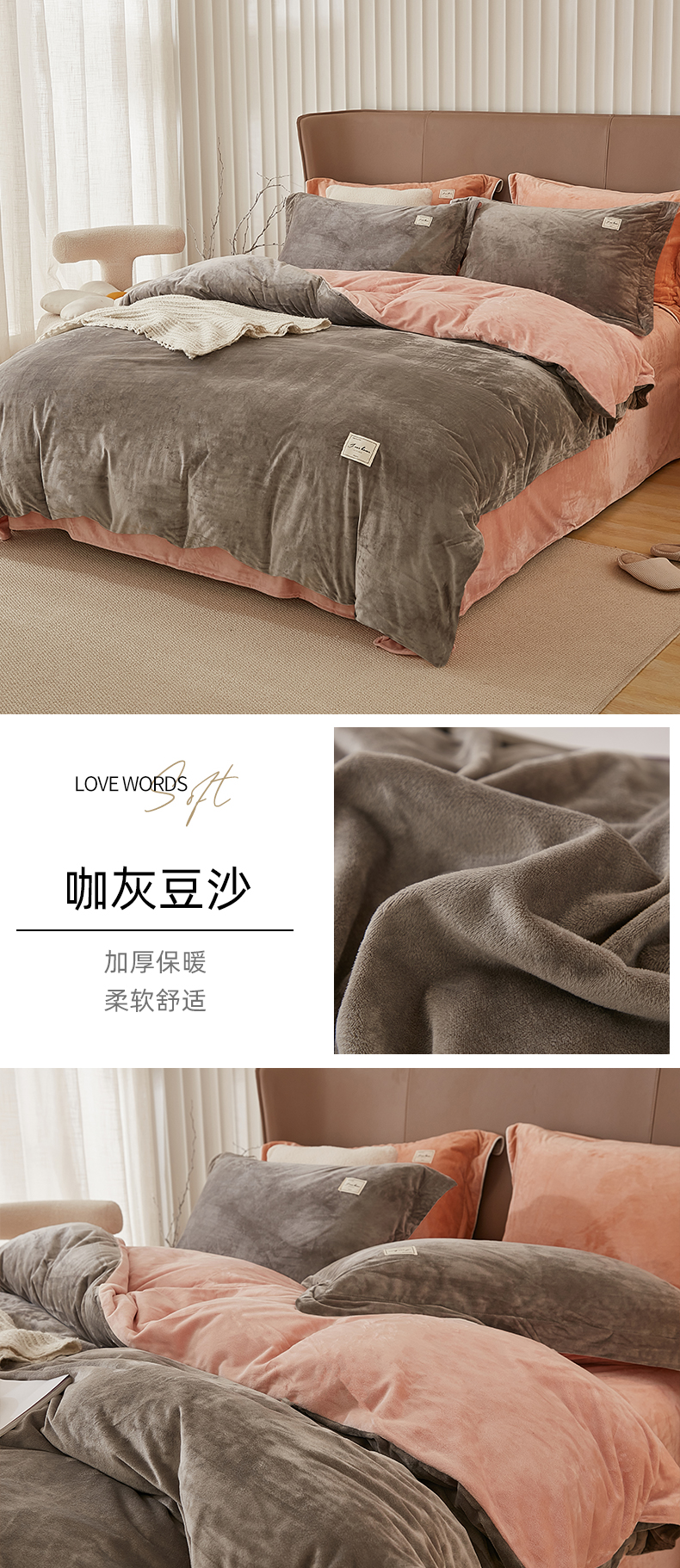 商品名称:悦然毛巾被 2025新款高克重德芙绒双拼四件套 咖灰豆沙