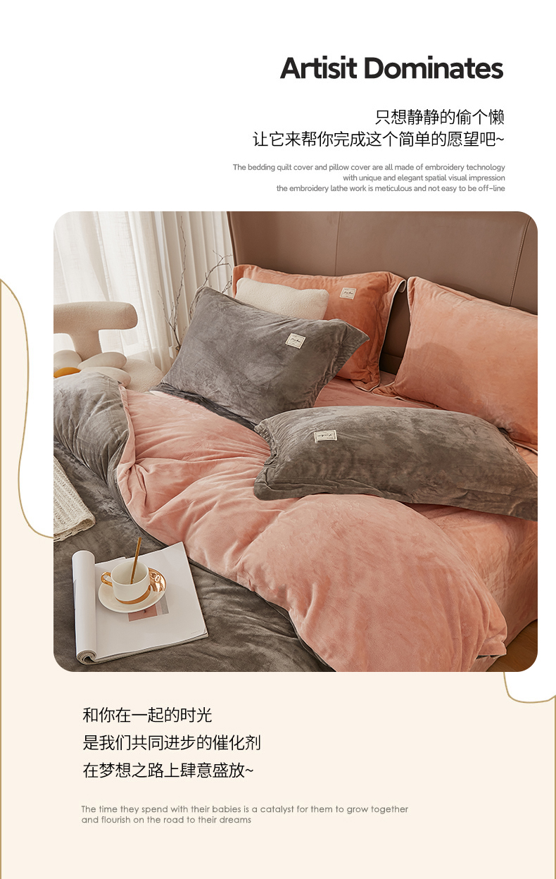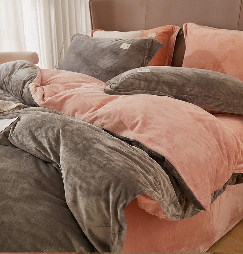 悦然毛巾被 2025新款高克重德芙绒双拼四件套 咖灰豆沙