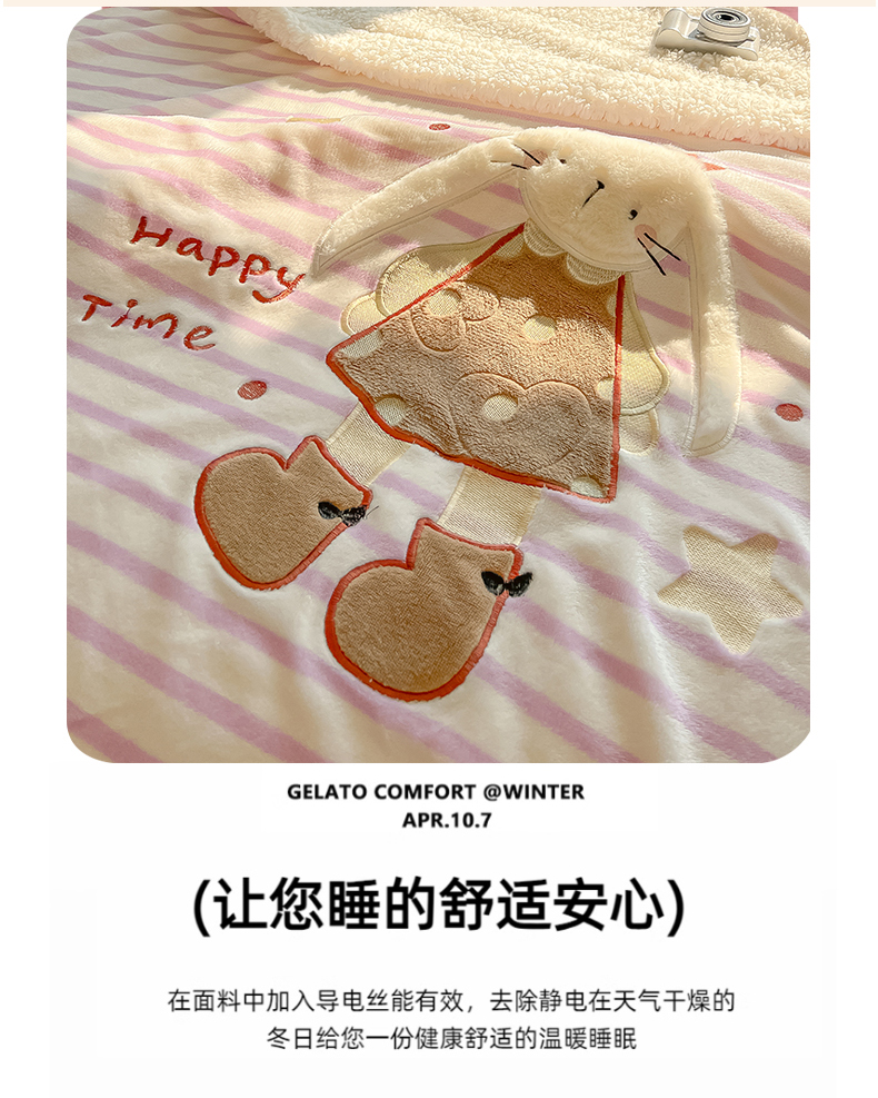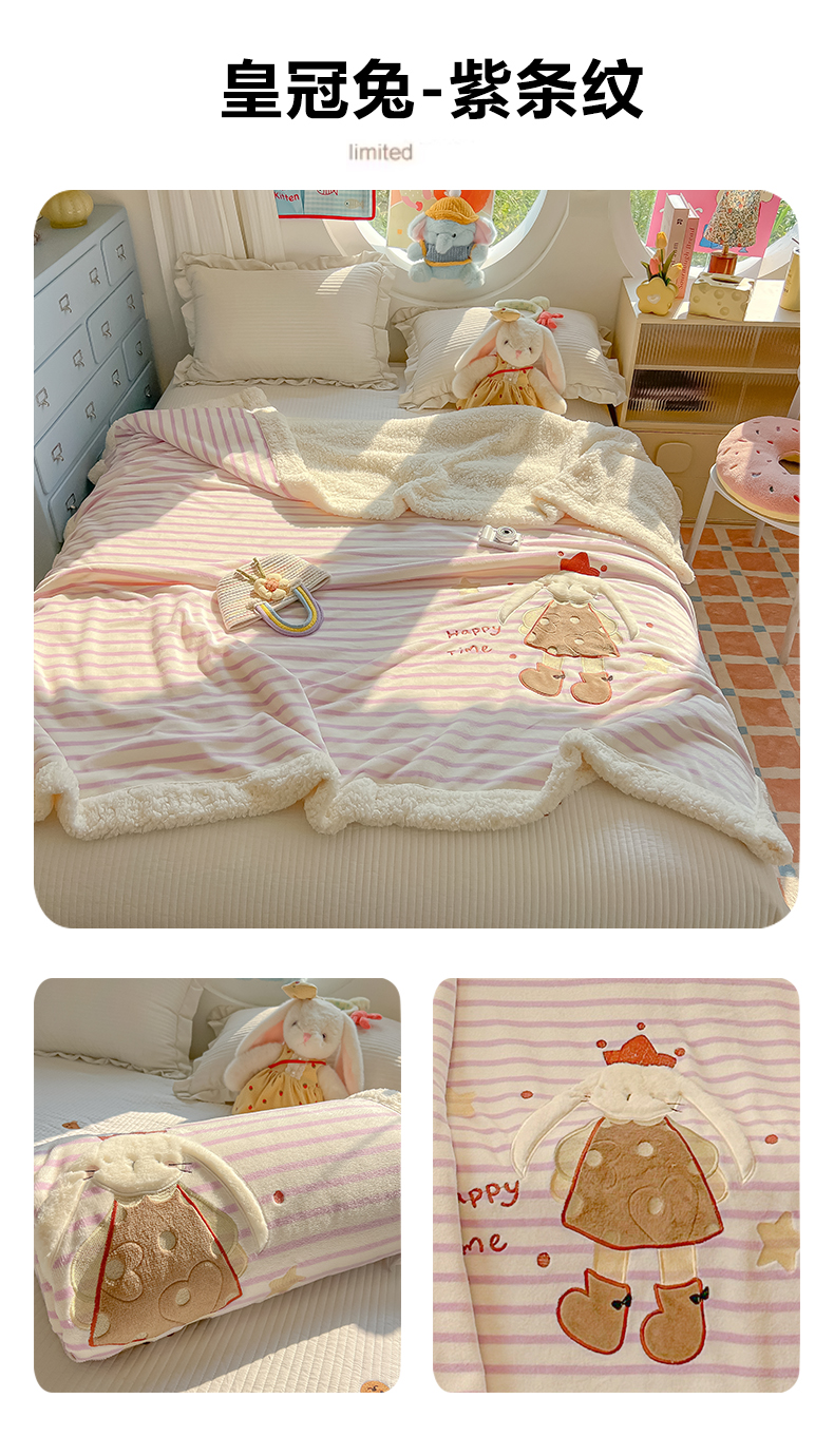 商品名称:子钦家纺 2025新款牛奶绒条纹贴布绣翻边毛毯 皇冠兔-紫条纹