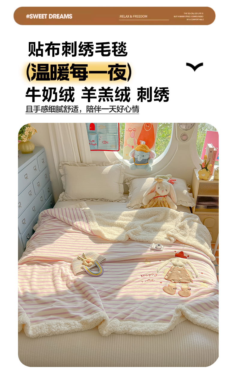 子钦家纺 2025新款牛奶绒条纹贴布绣翻边毛毯 皇冠兔-紫条纹