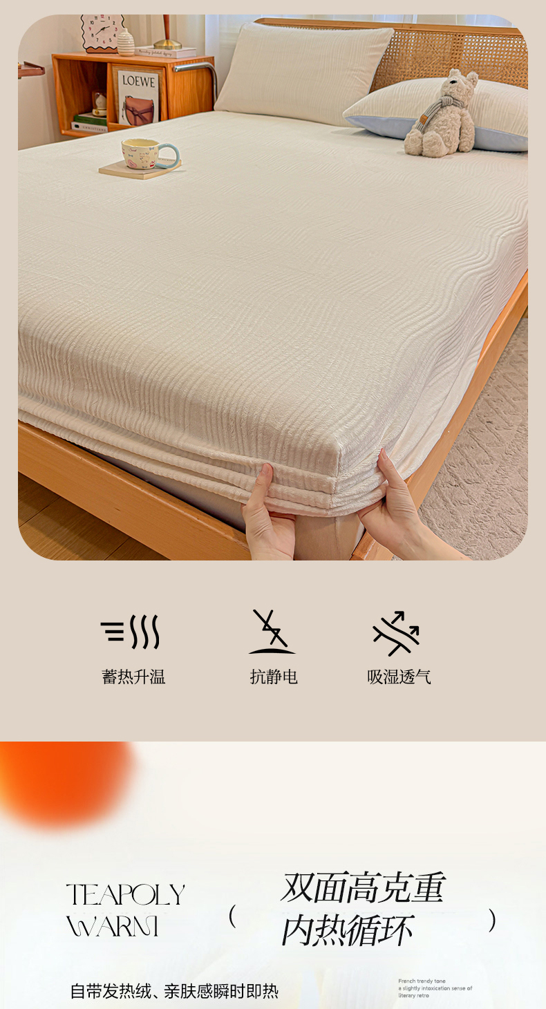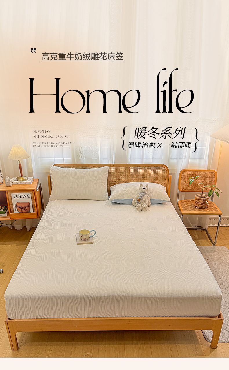 • 91家纺网 家纺一手货源 找家纺 灰鲸 2025新款纯色简约高克重雕花牛奶绒单品床笠 温妮-奶昔白