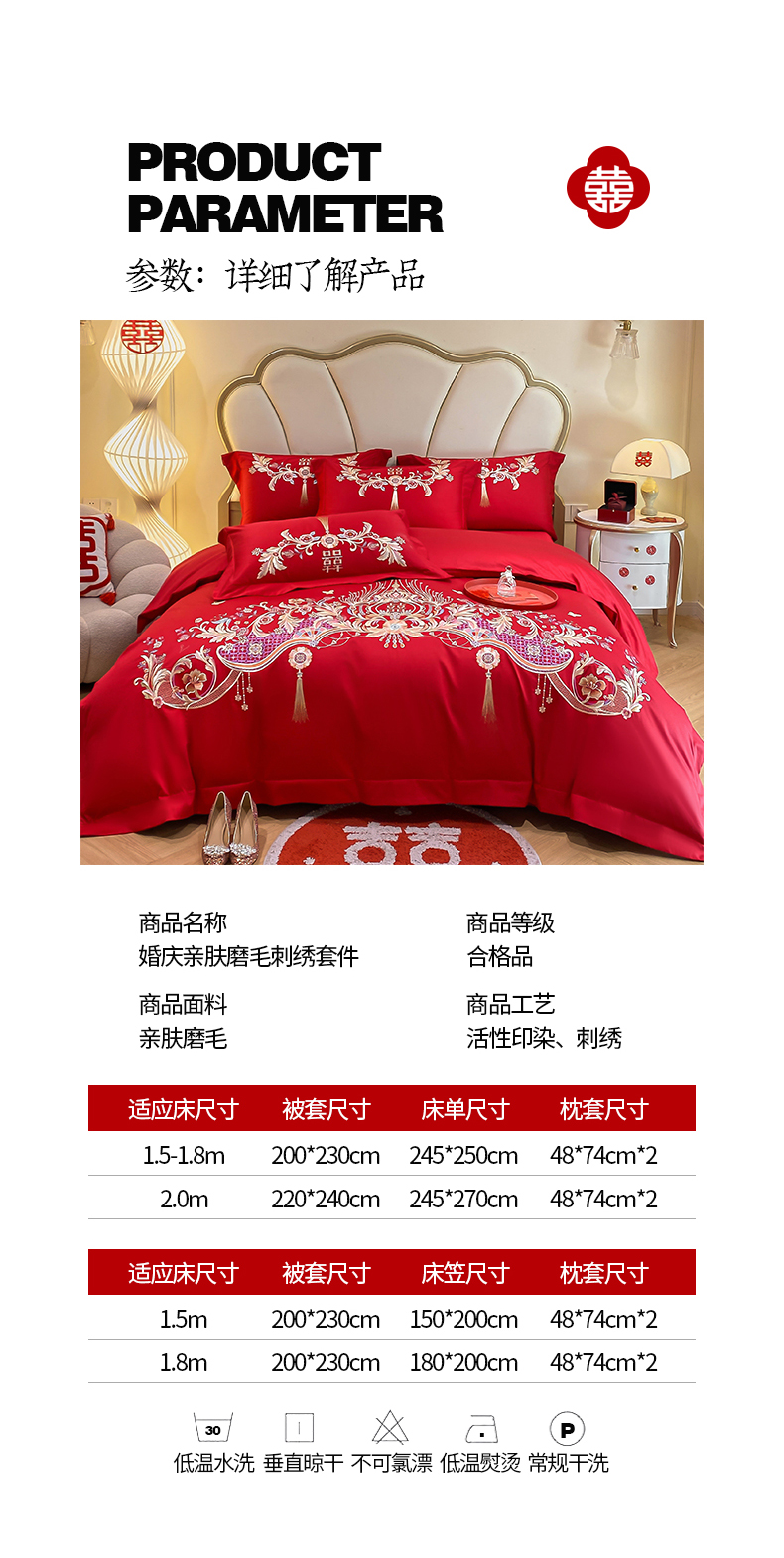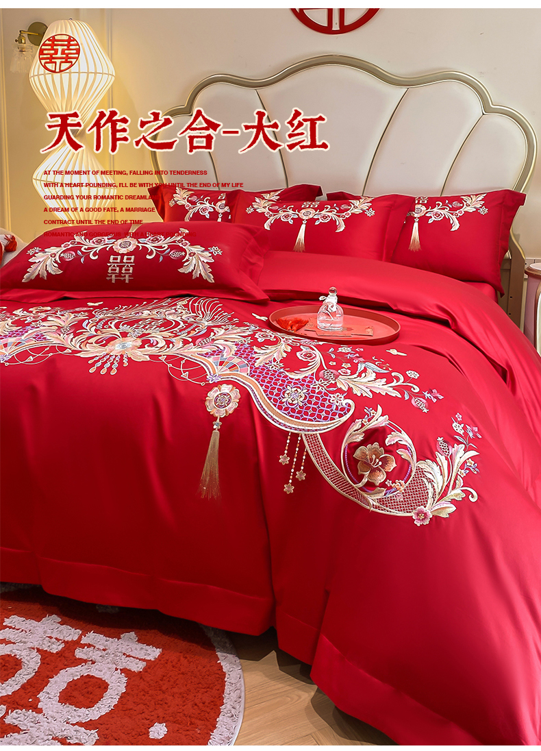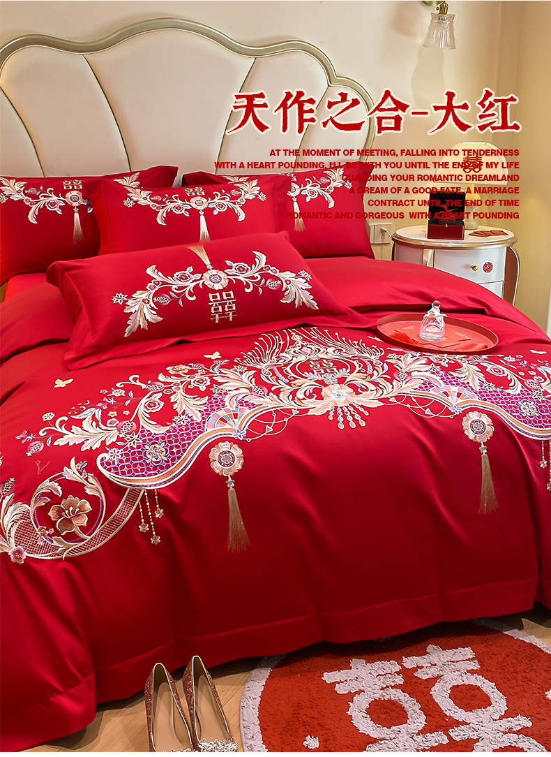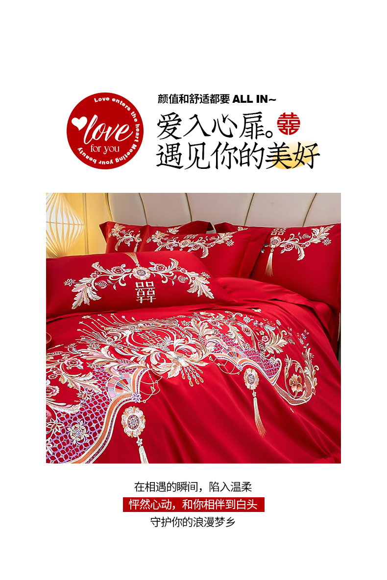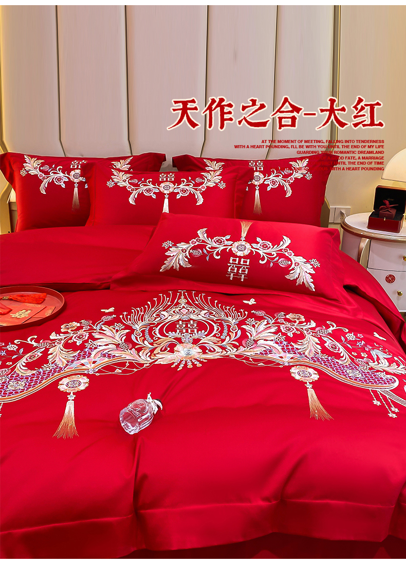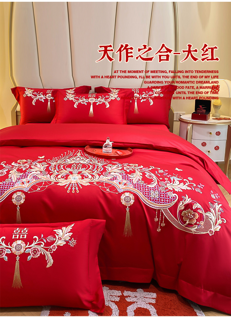 当前位置: 91家纺网 > 商品网购 > 床品套件 > 四件套 > 婚庆四件套 > 置顶家纺 2025新款亲肤磨毛刺绣婚庆四件套系列-棚拍 天作之合-大红