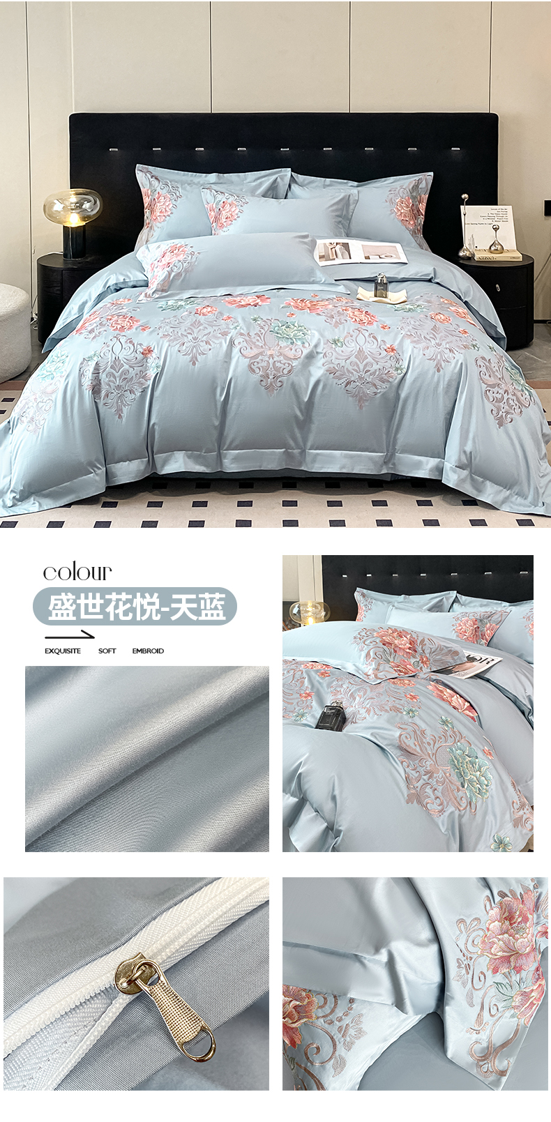 (总)置顶家纺 2026新款亲肤棉玫瑰刺绣提花卡罗拉系列四件套,卡罗拉-碧蓝,卡罗拉-魅粉,卡罗拉-浅香槟,卡罗拉-天空蓝