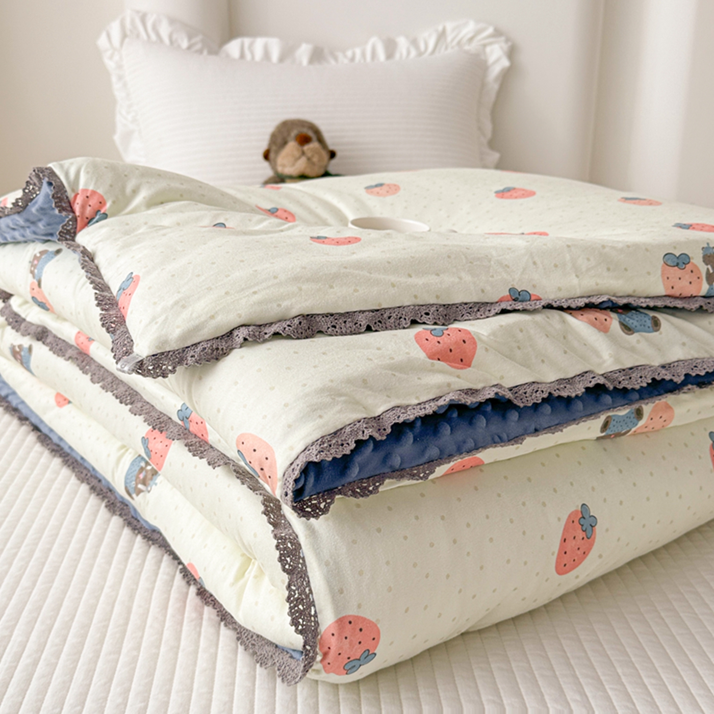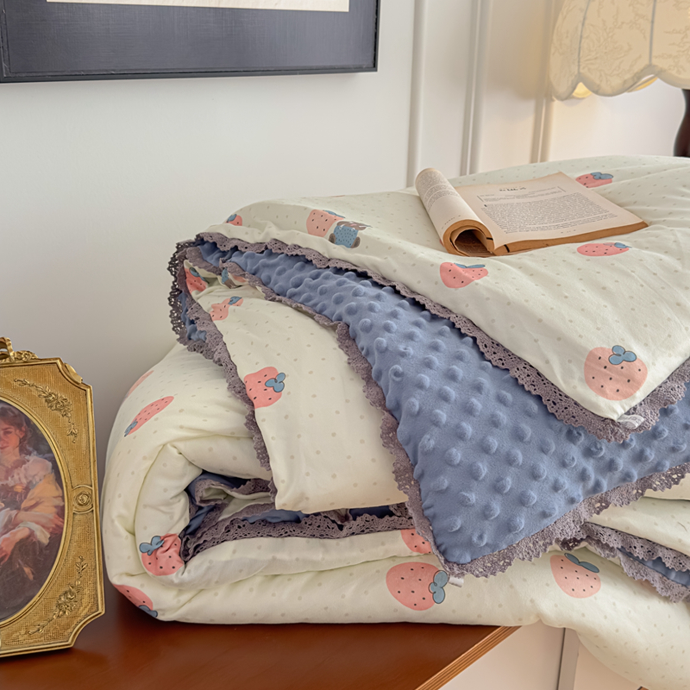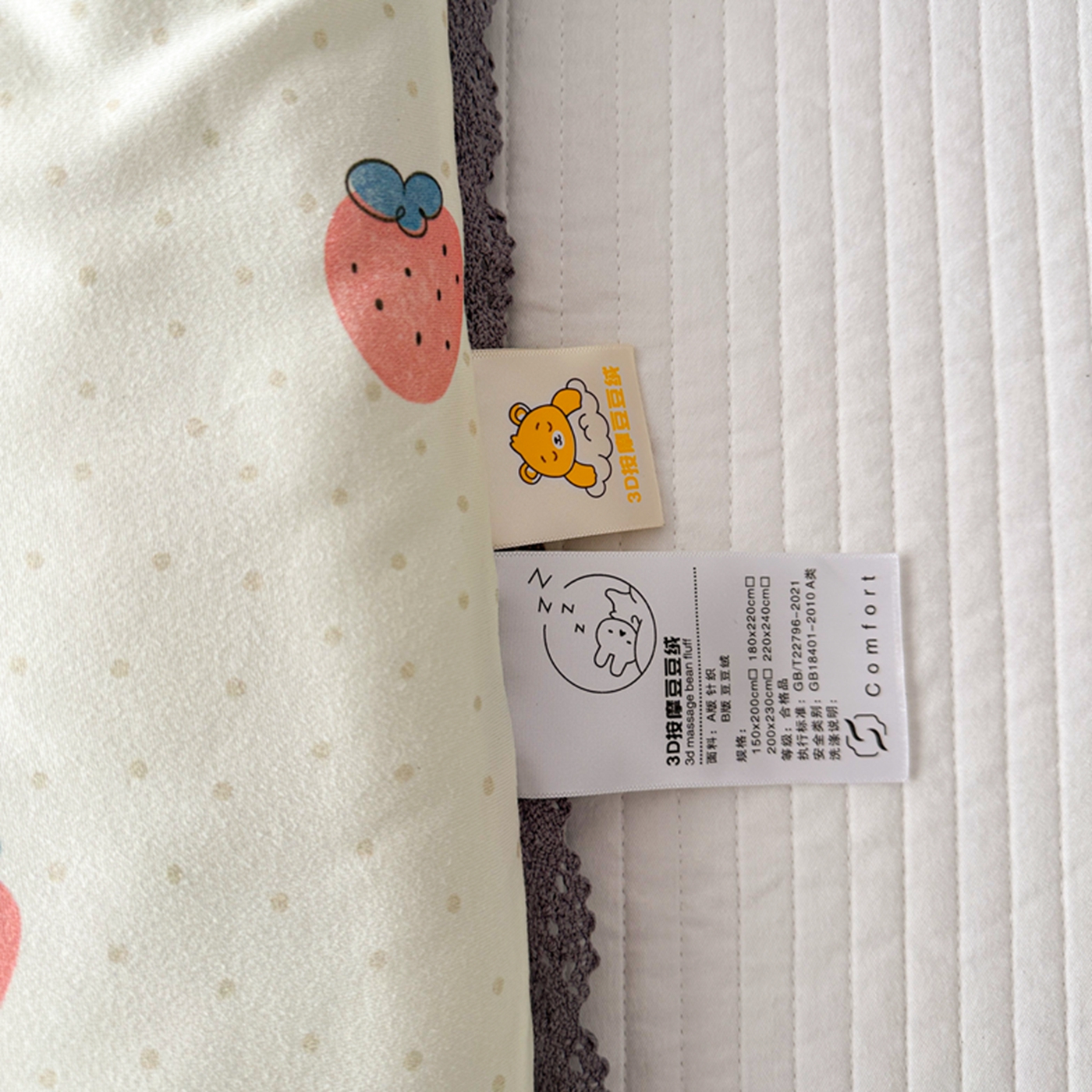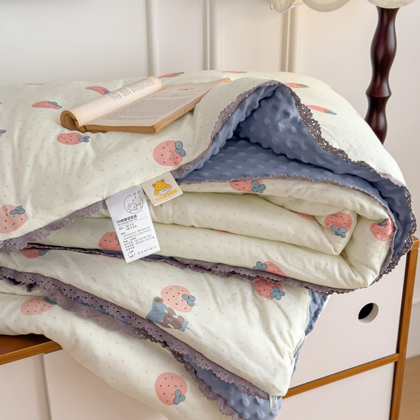 商品名称:睡美美家纺 2025新款秋冬亲肤柔软豆豆绒花边款冬被被芯 草莓日记