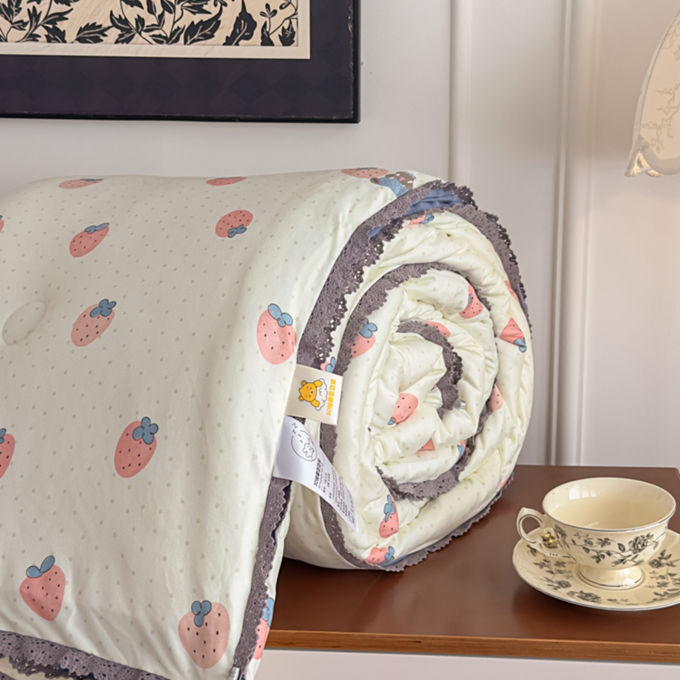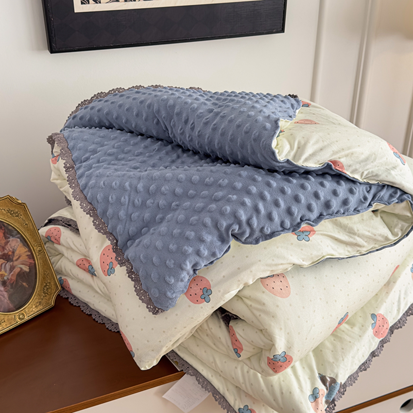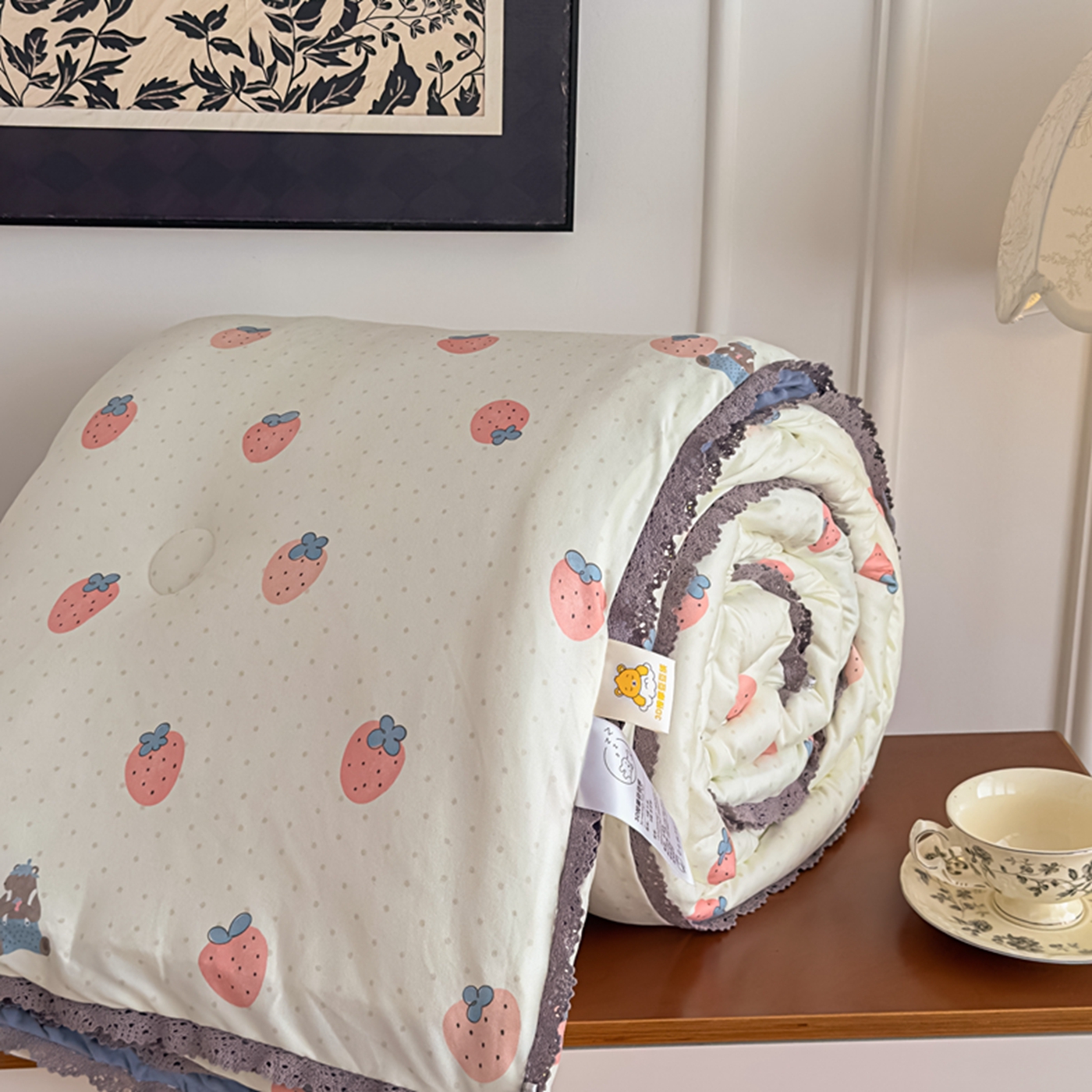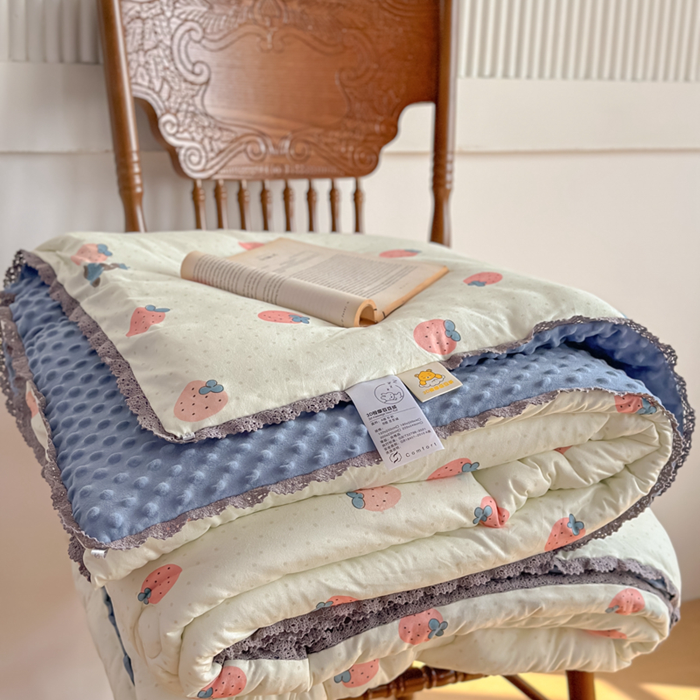 商品名称:睡美美家纺 2025新款秋冬亲肤柔软豆豆绒花边款冬被被芯 草莓日记
