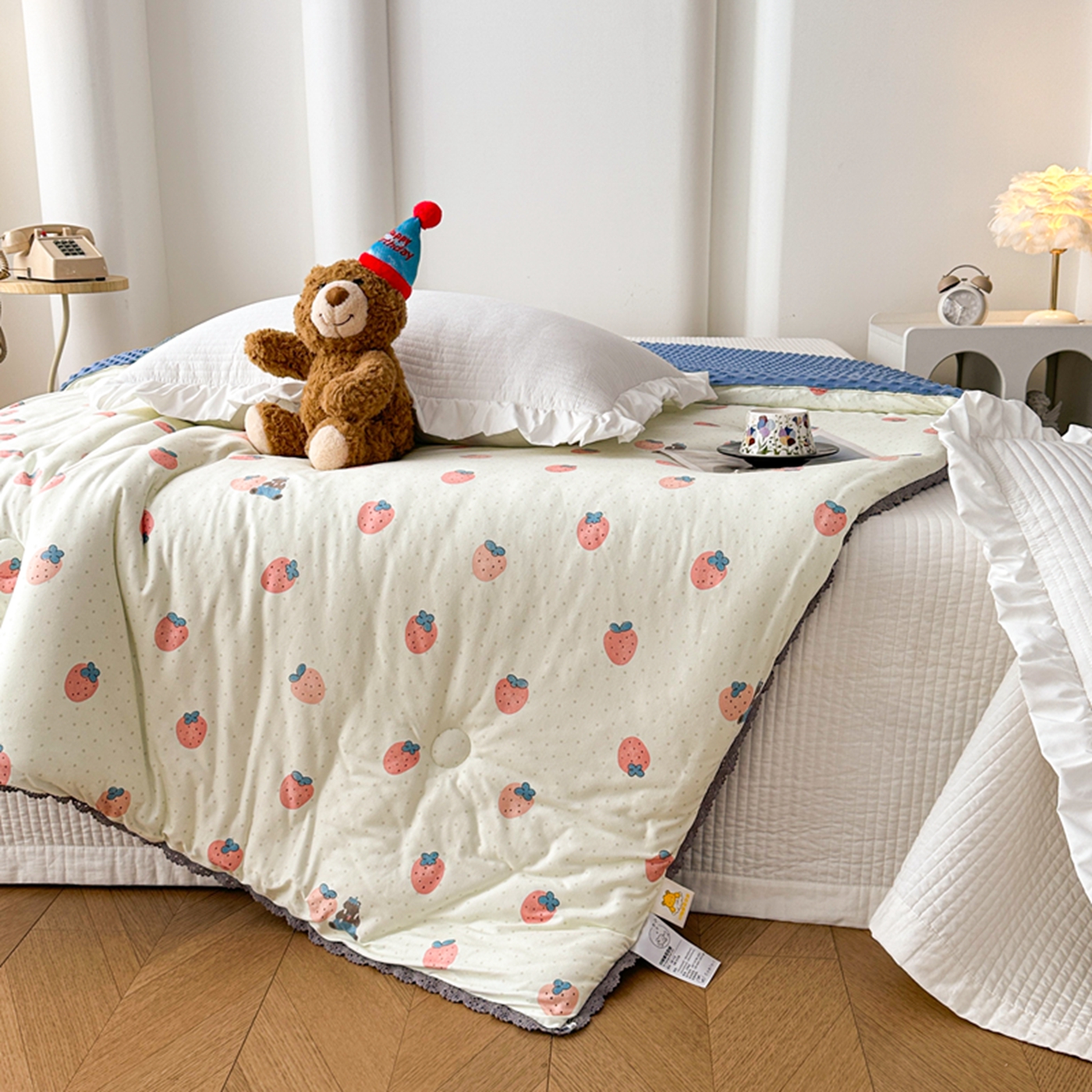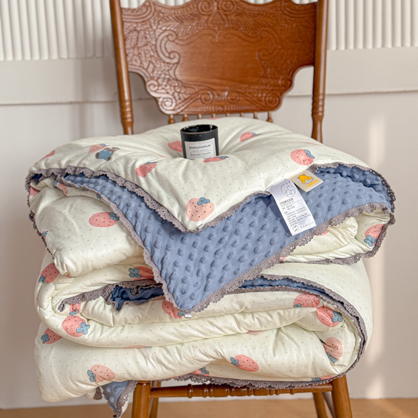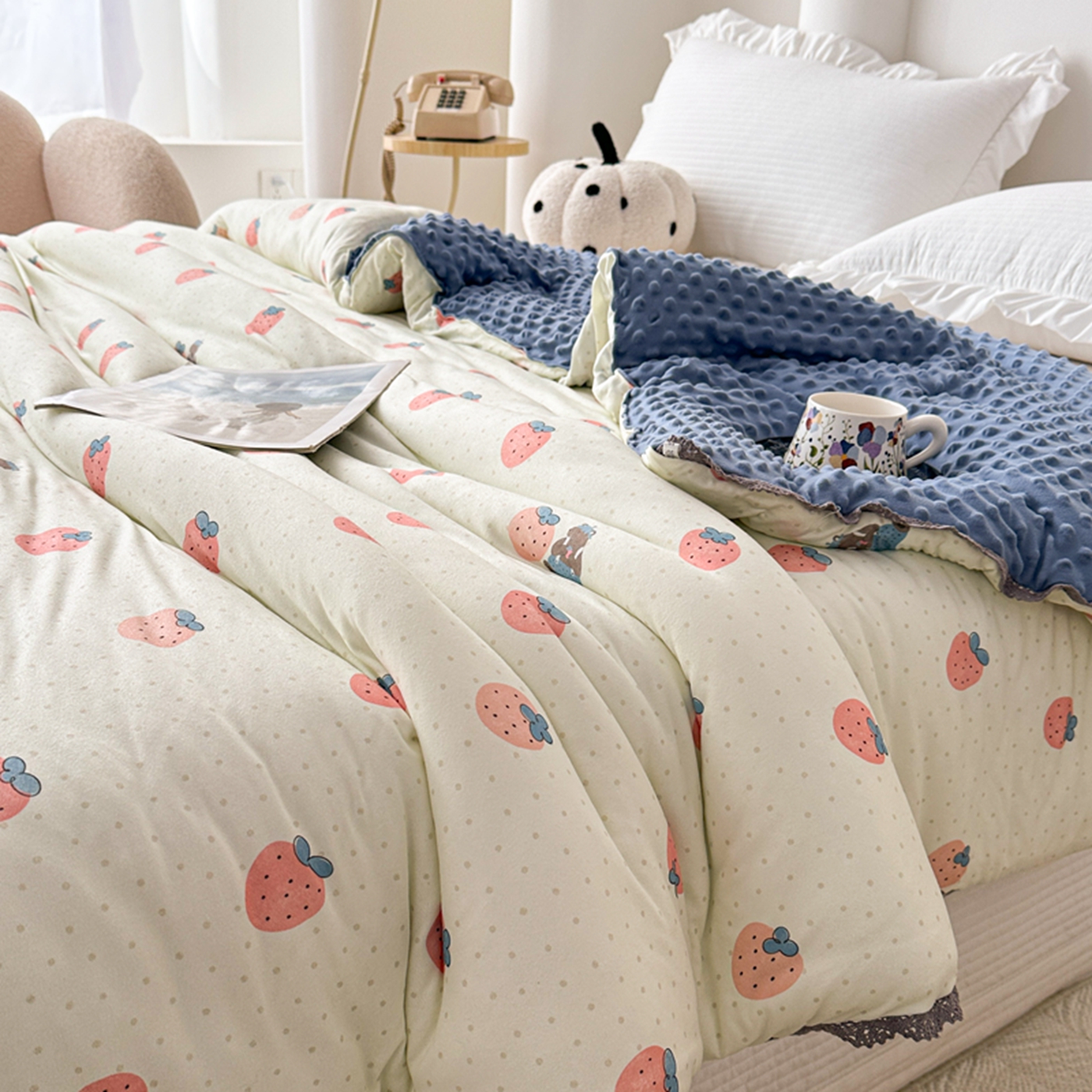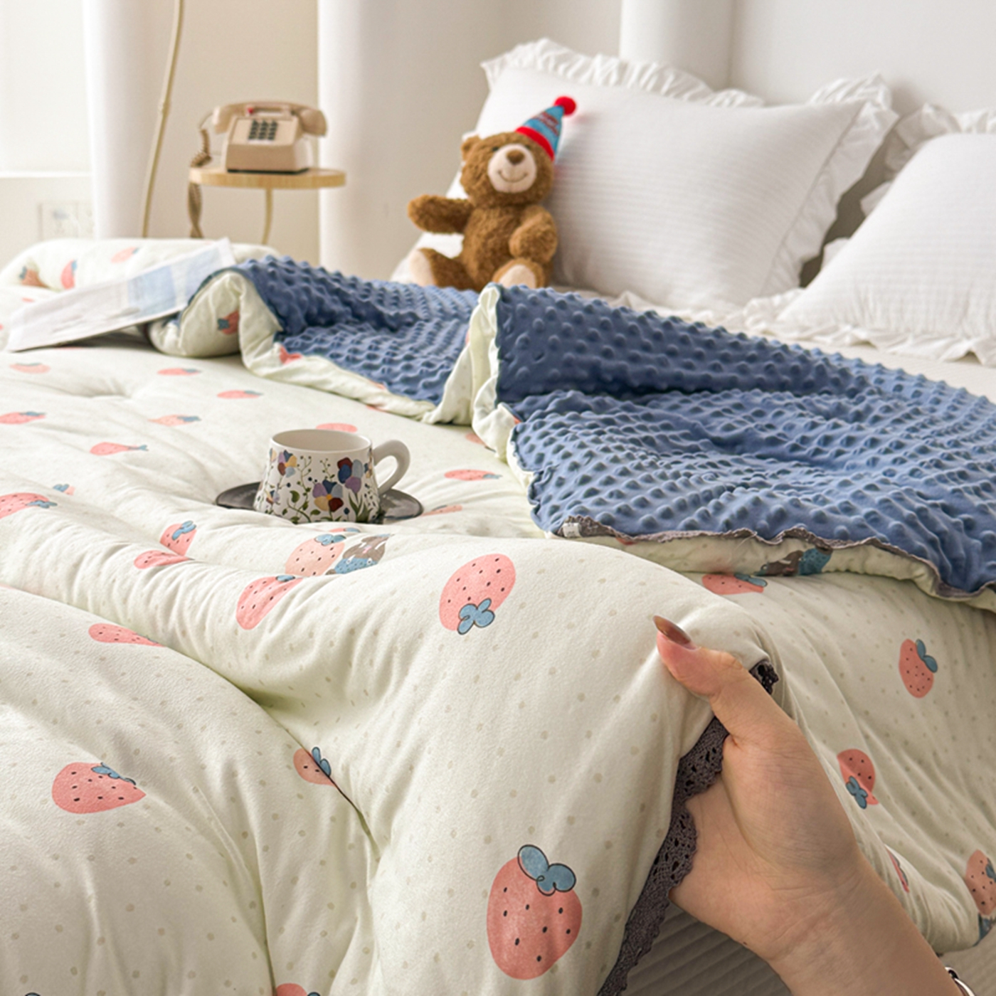 商品名称:睡美美家纺 2025新款秋冬亲肤柔软豆豆绒花边款冬被被芯 草莓日记