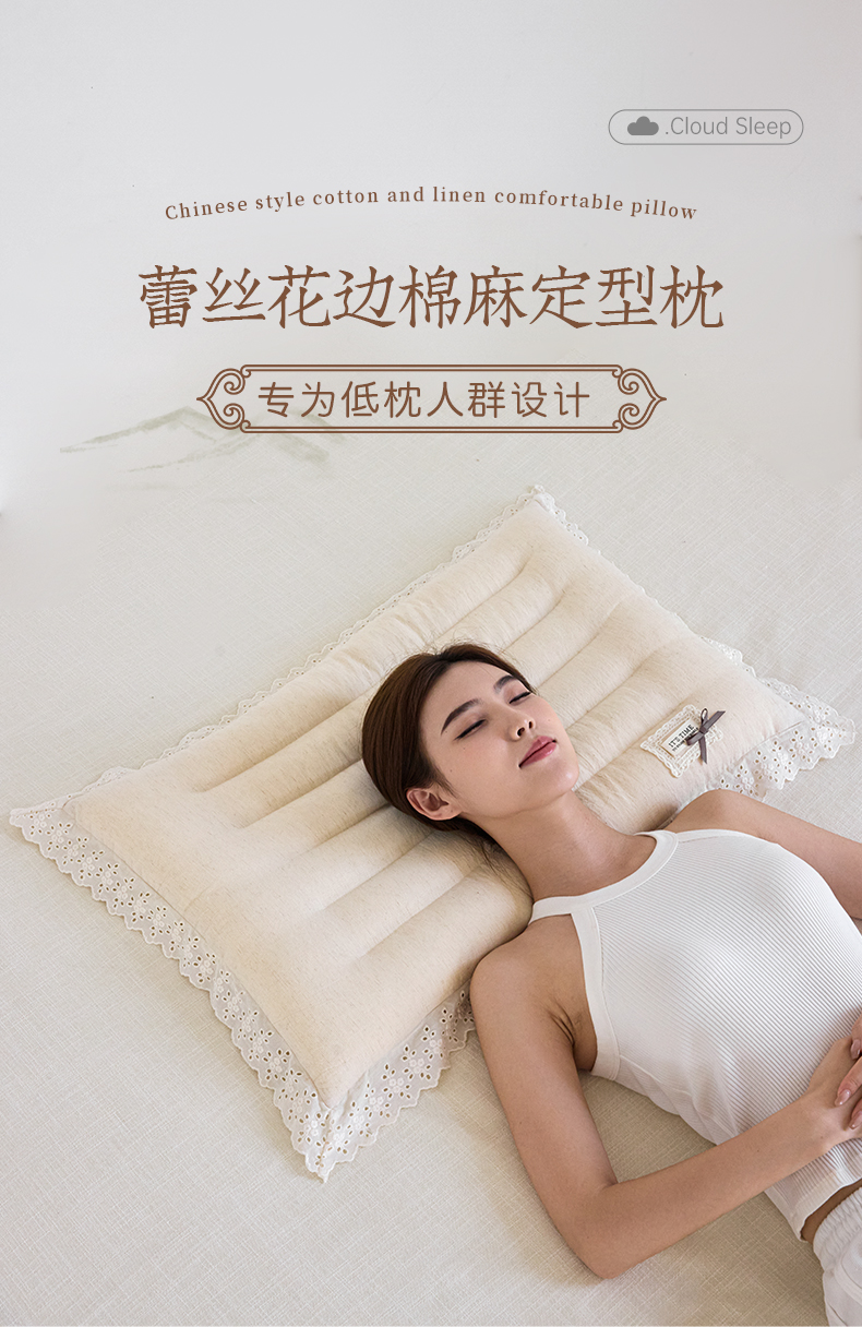 (总)昕科 2025新款蕾丝花边棉麻定型低枕-实拍版-亚麻低枕头蕾丝花边成人枕芯,蕾丝花边棉麻定型低枕
