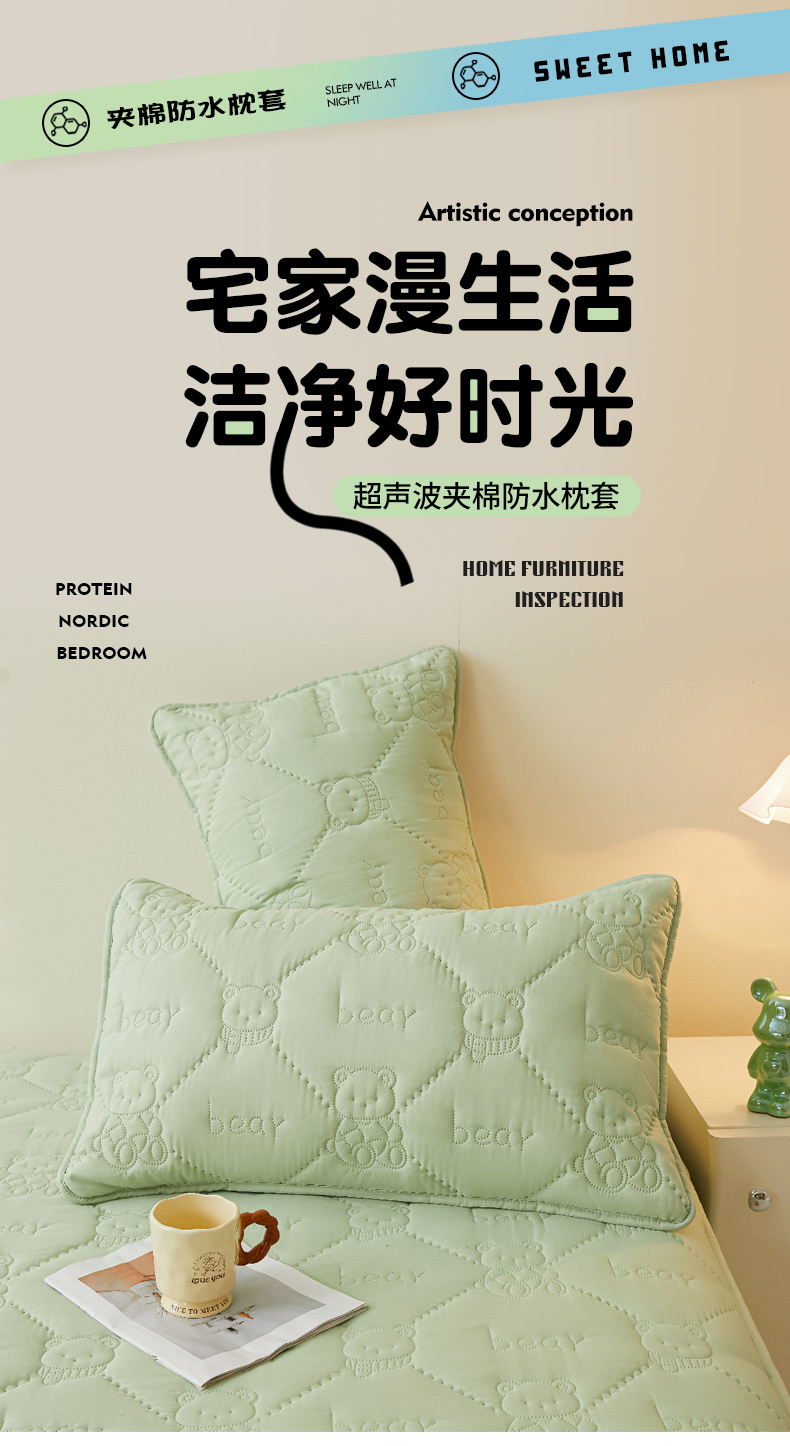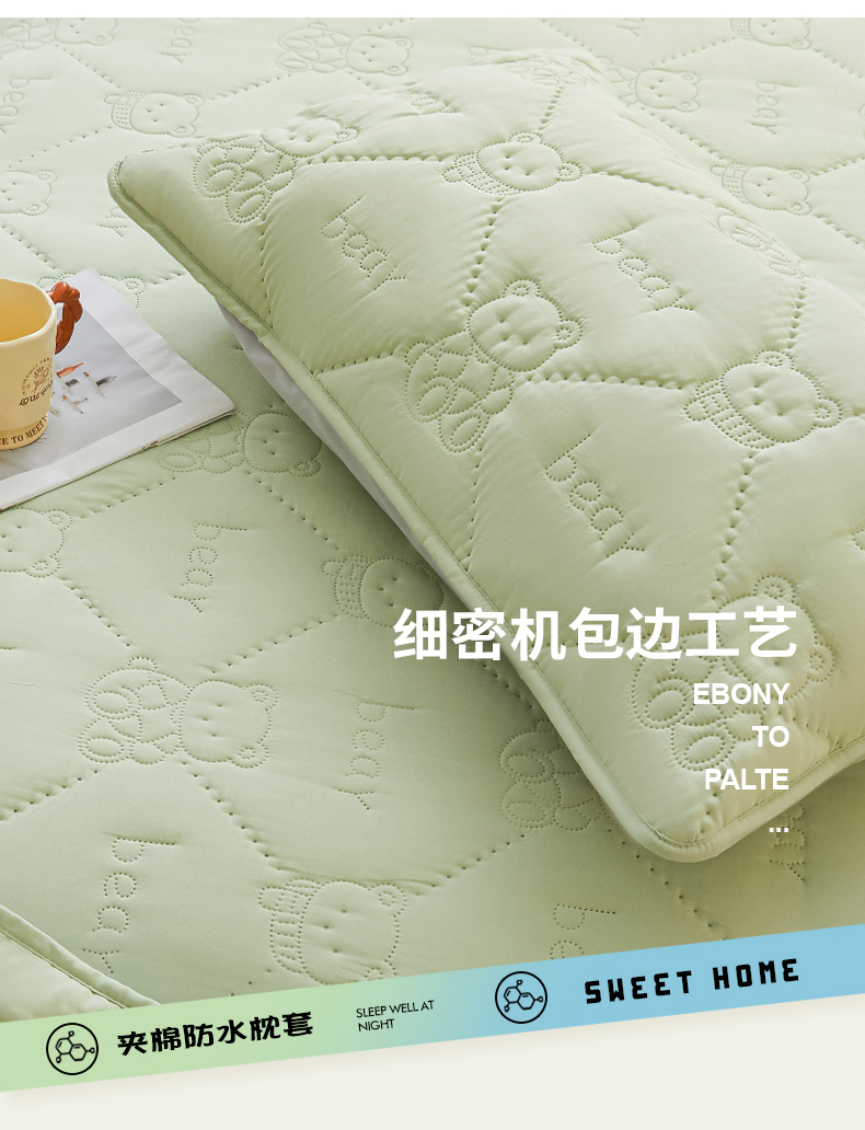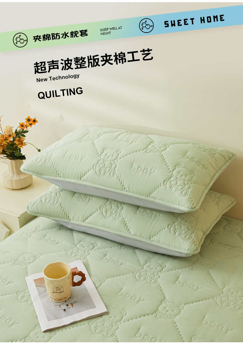• 91家纺网 家纺一手货源 找家纺 LIFE.丽芙 2025新款磨毛超声波夹棉防水枕套机包边款 小熊防水夹棉枕套-松石绿