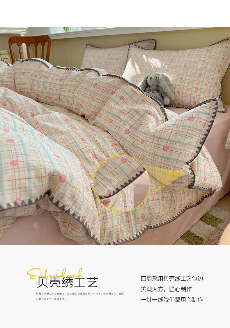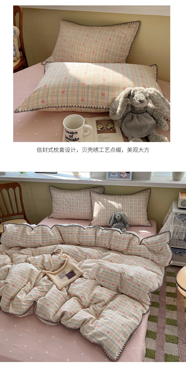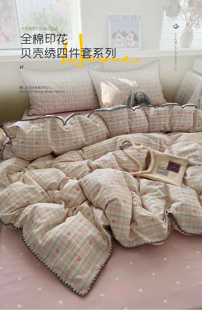 瑞莱 2026新款全棉印花贝壳边四件套 粉爱心格