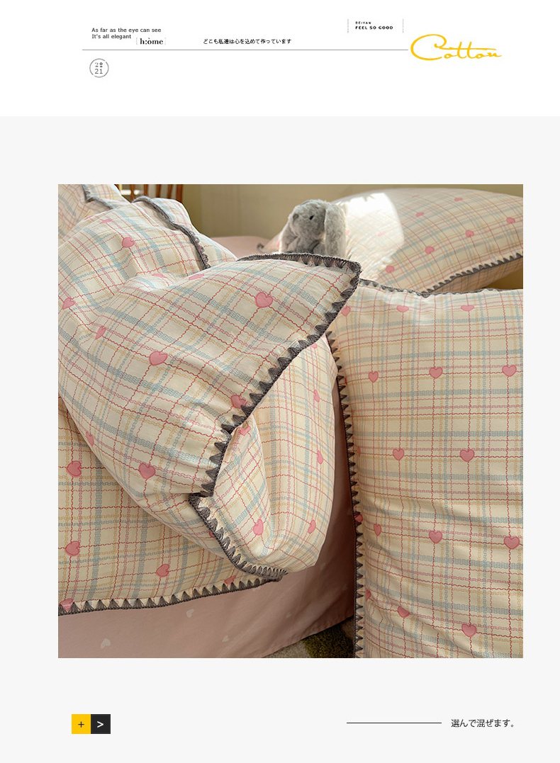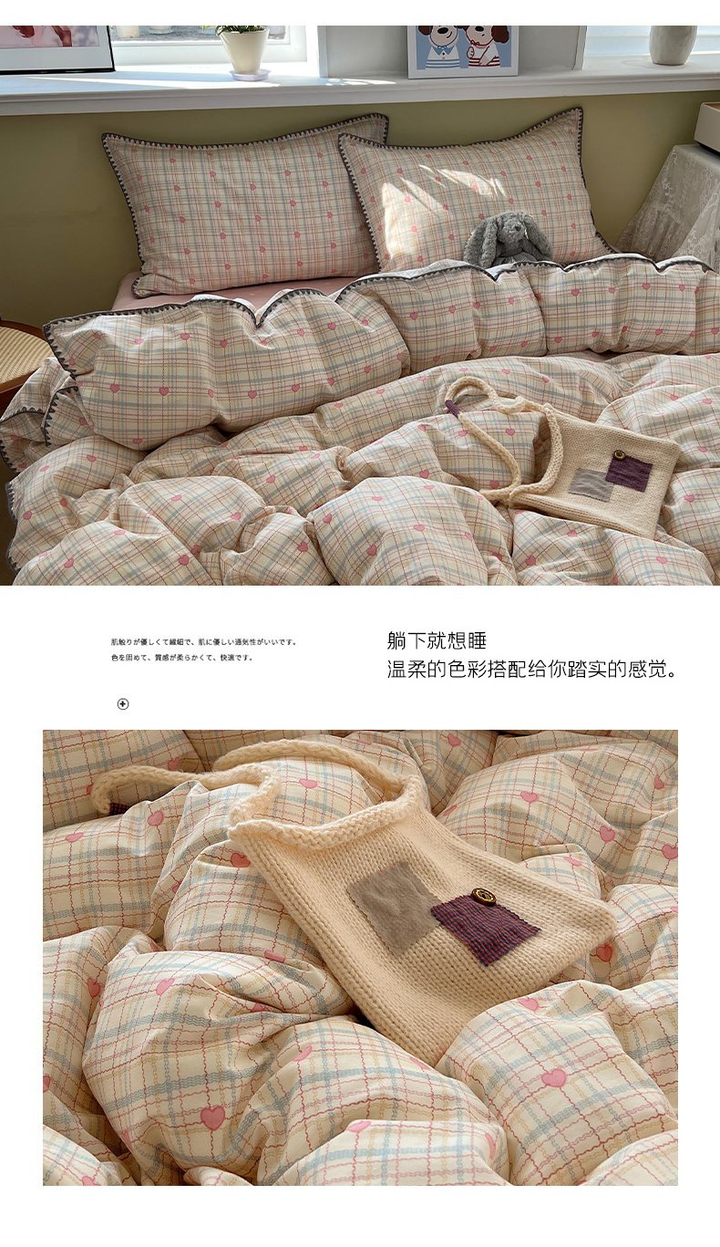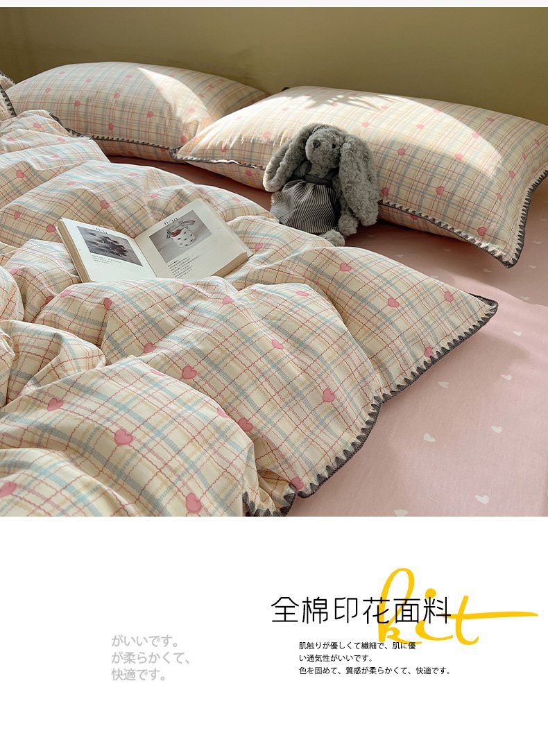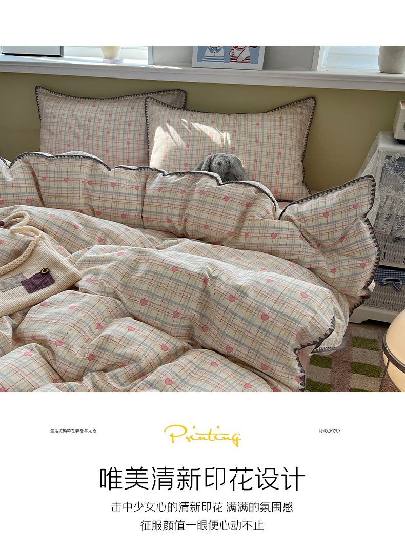 瑞莱 2026新款全棉印花贝壳边四件套 粉爱心格