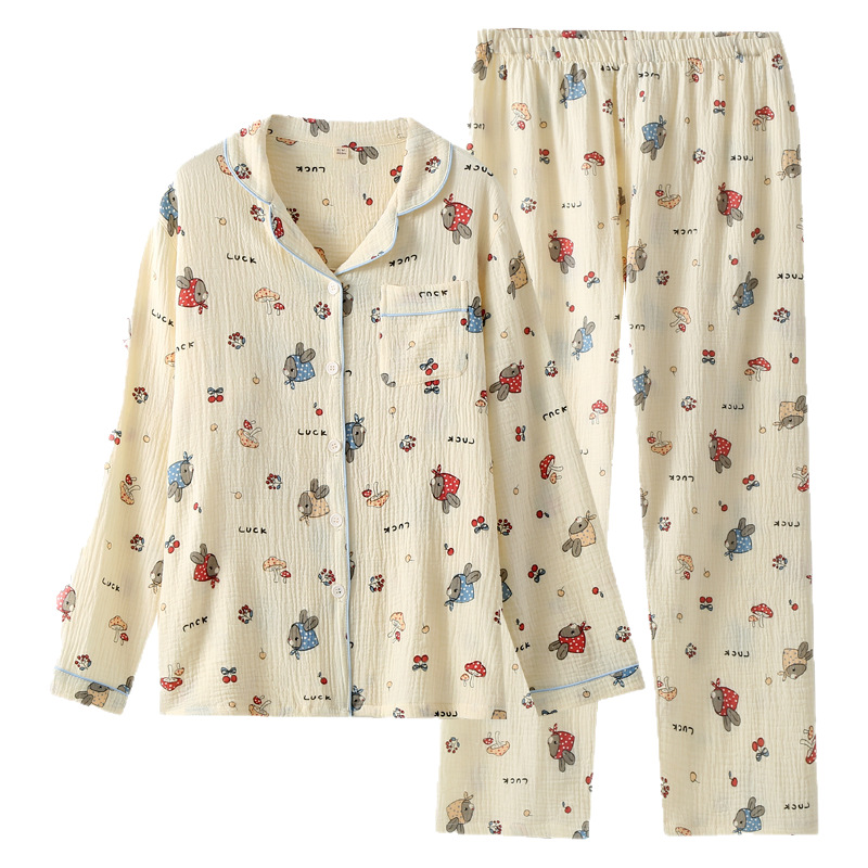 洛兰沙家居馆 2025新款双层绉纱棉纱卡通系列女士家居服睡衣长袖长裤透气舒适四季款纯棉 棉朵小狗