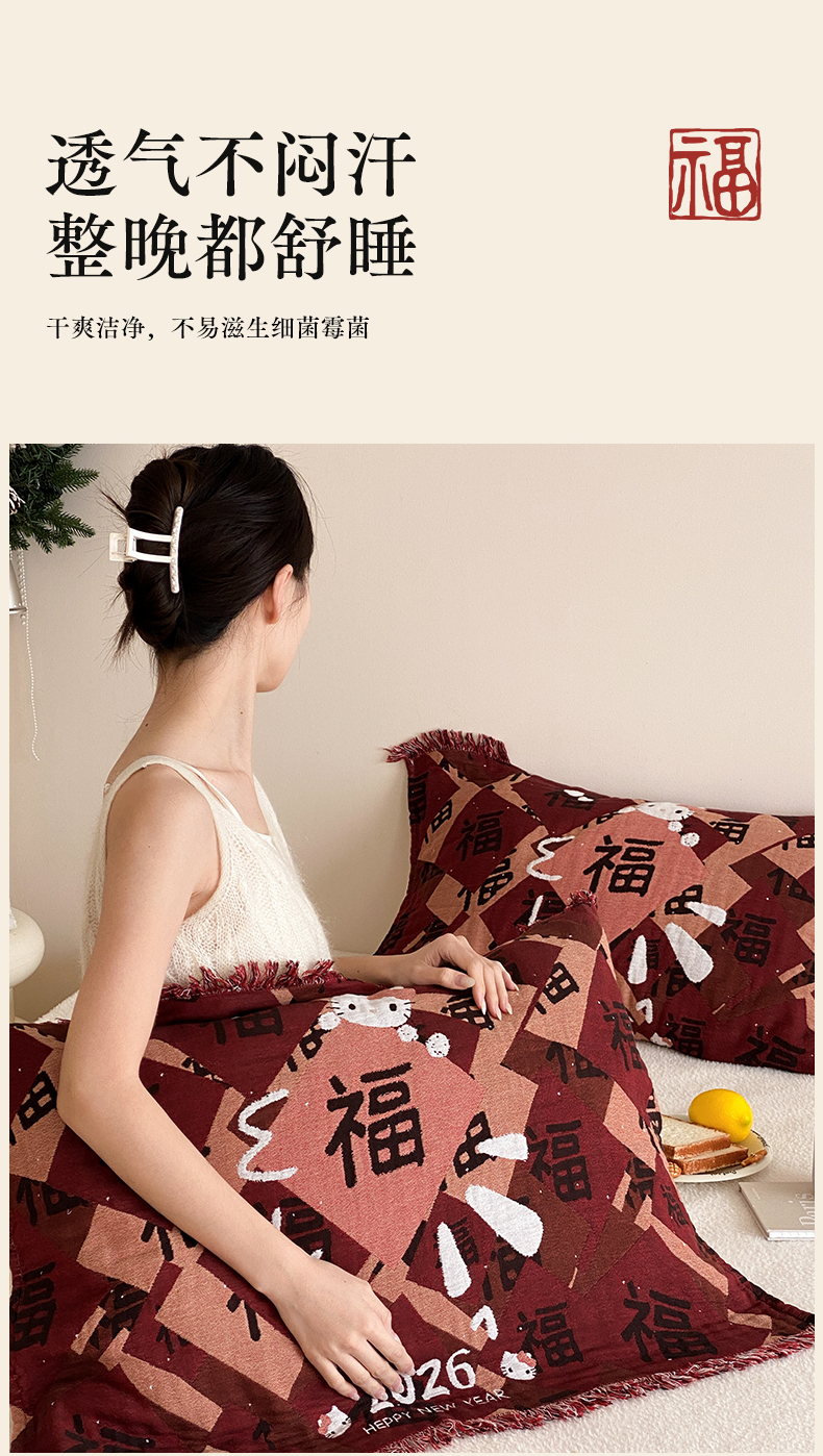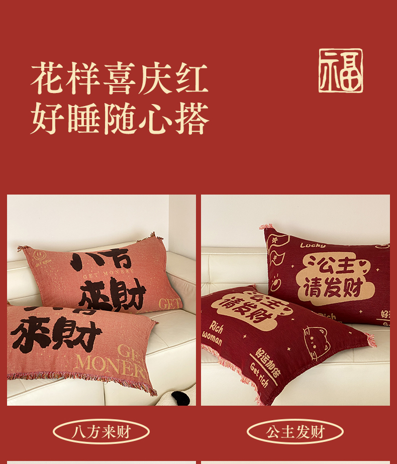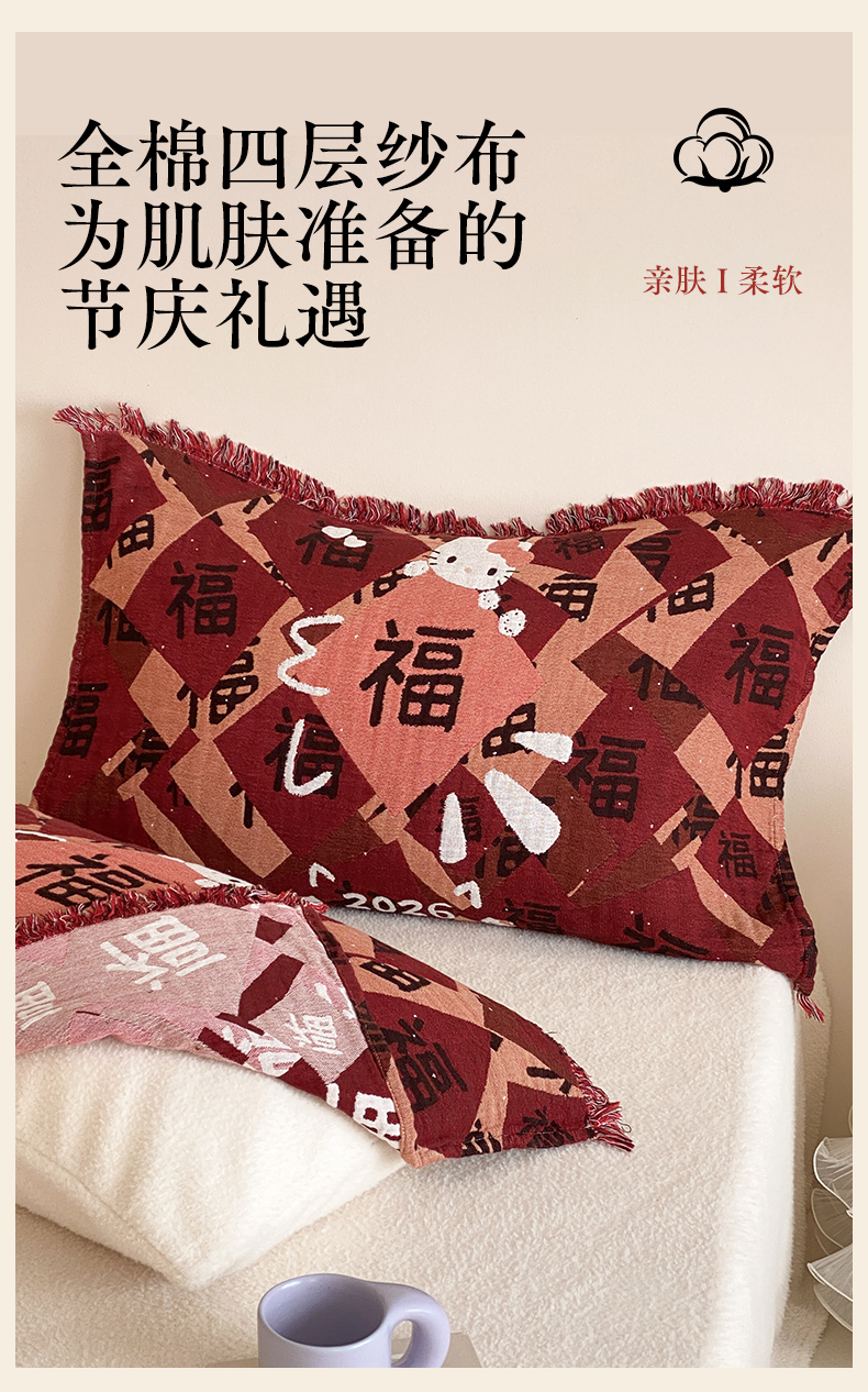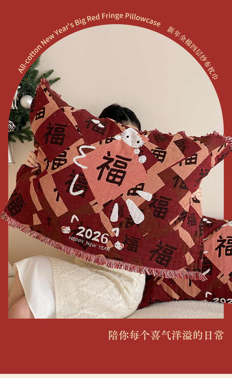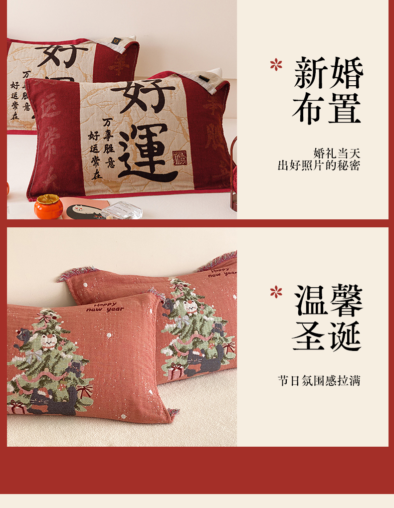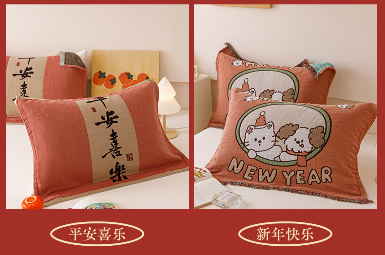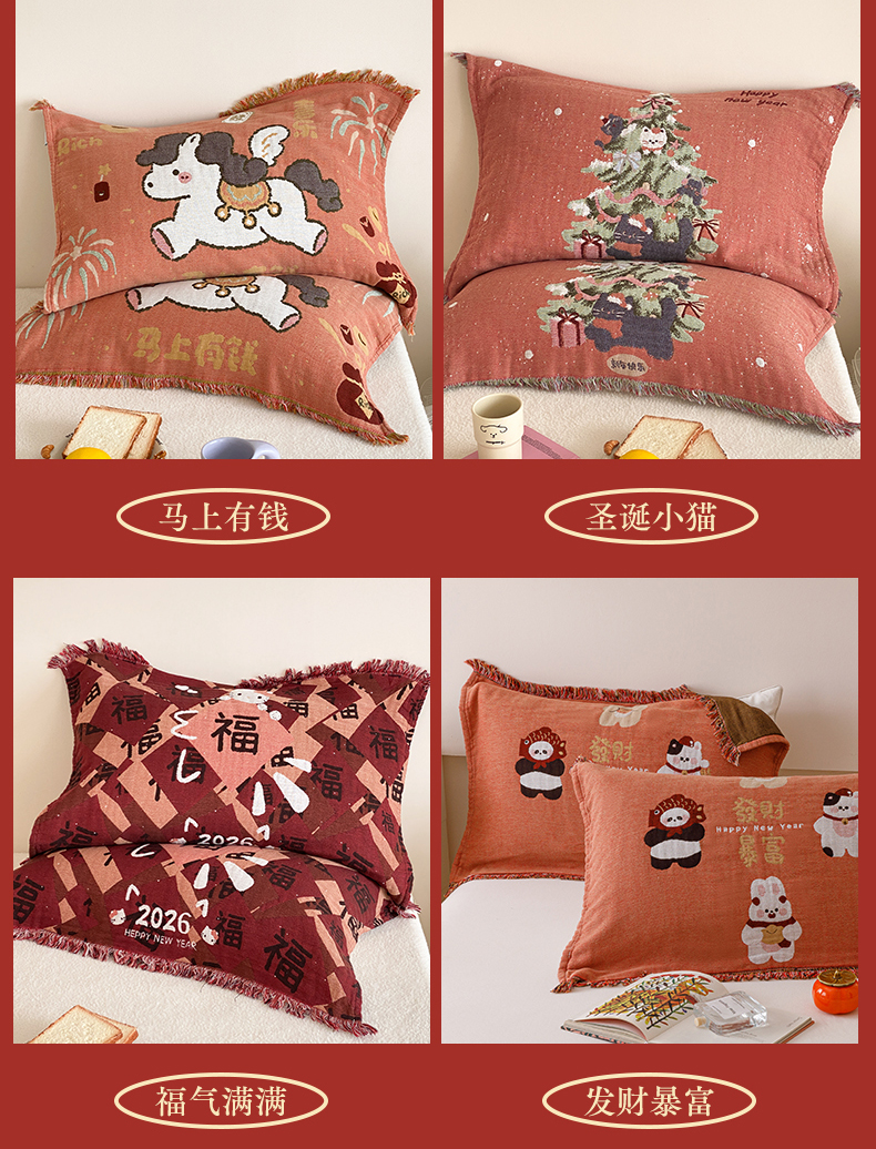 (总)麻依 2025新款四层纱布全棉新年大红枕巾流苏婚庆枕盖,八方来财,发财暴富,福禄,福气满满,福娃,公主发财,好运,锦鲤,马上有钱,平安喜乐,圣诞小猫,新年快乐,组合