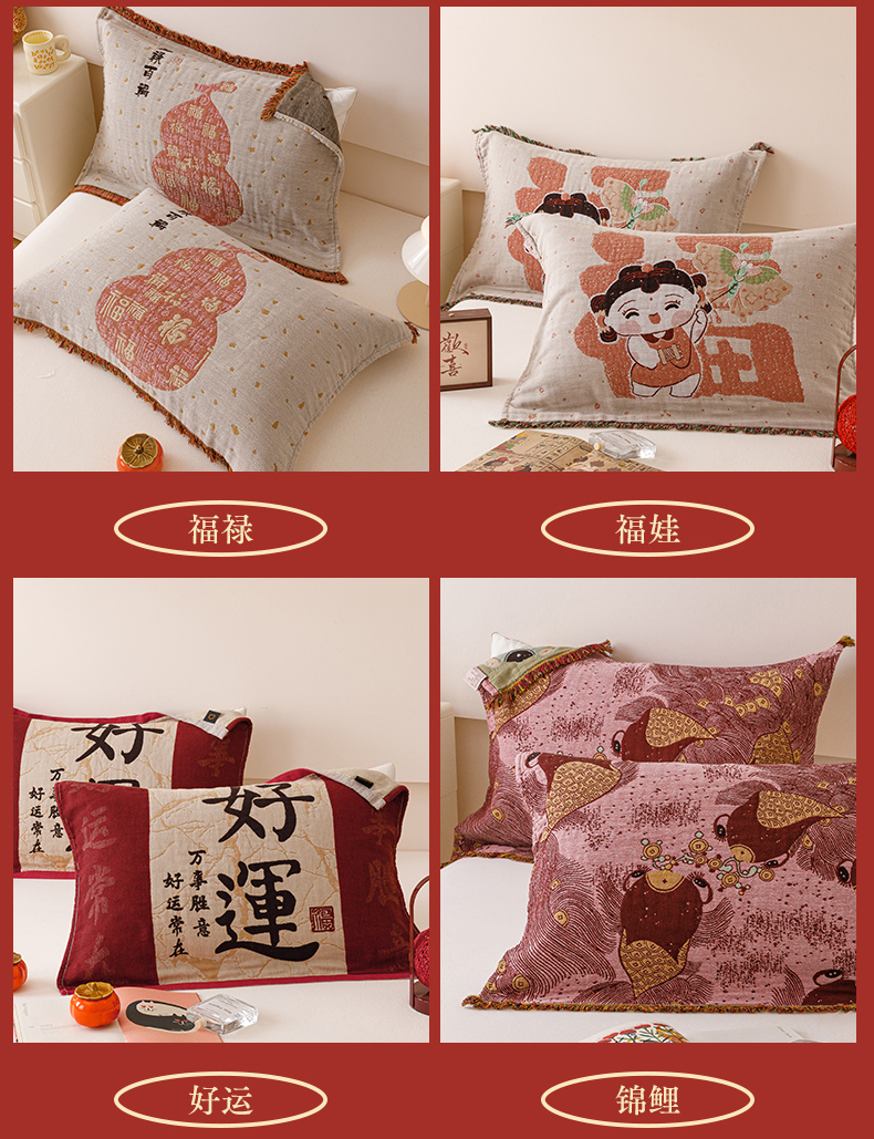 (总)麻依 2025新款婚庆全棉流苏款四层纱布枕巾,发财暴富52*75,福禄52*75,福娃52*75,好运52*75,锦鲤52*75,平安喜乐52*75,新年快乐52*75