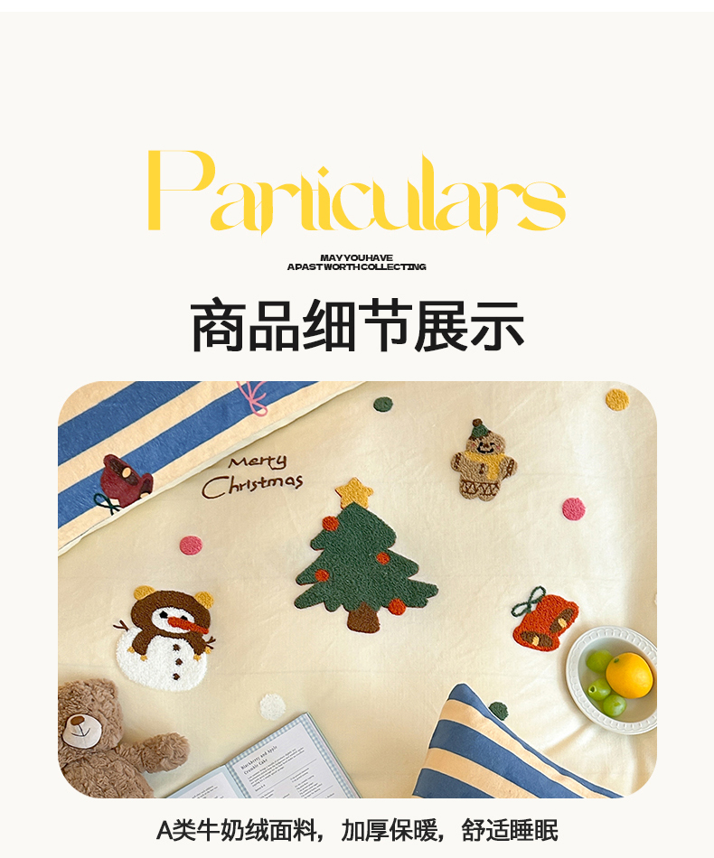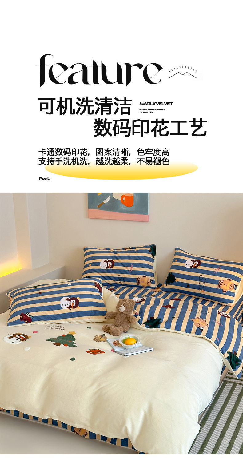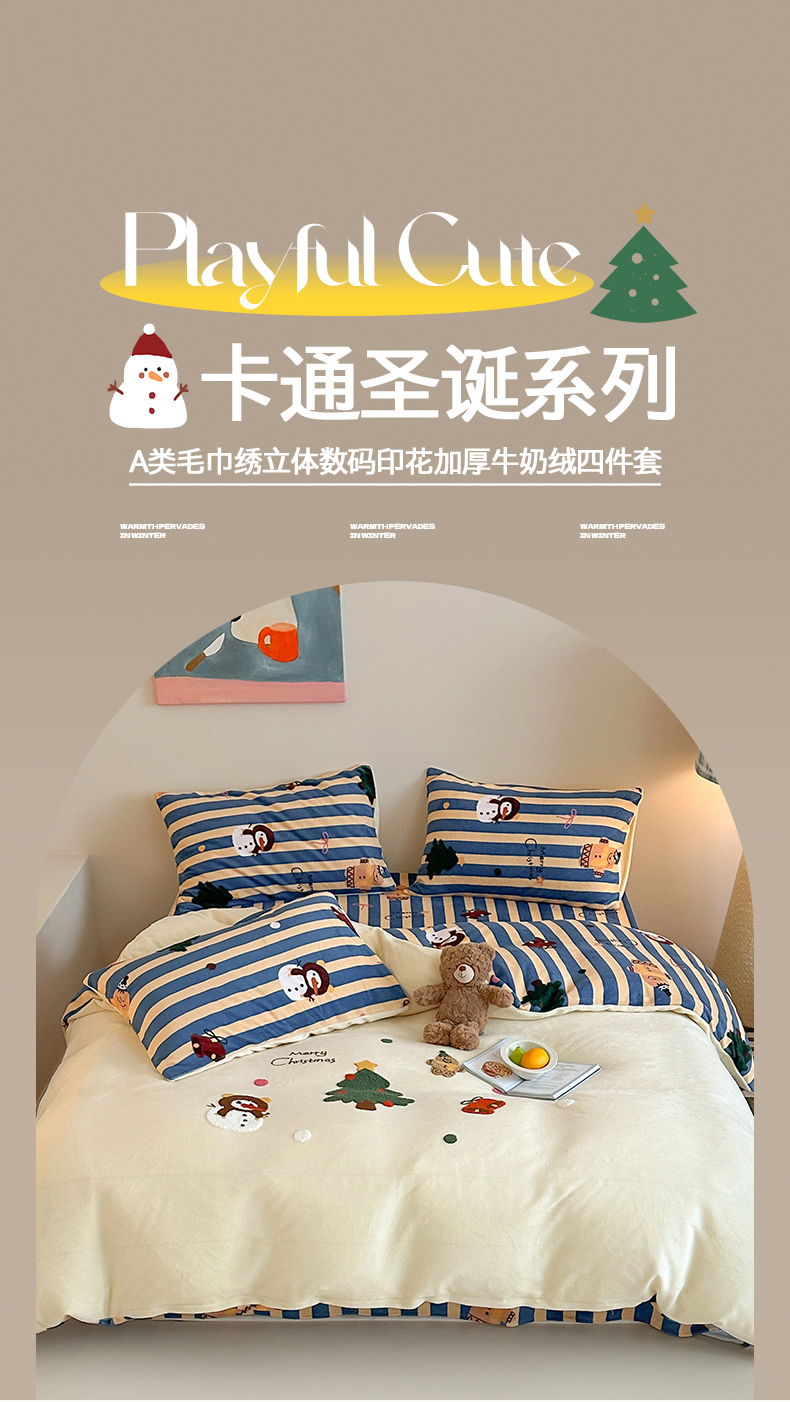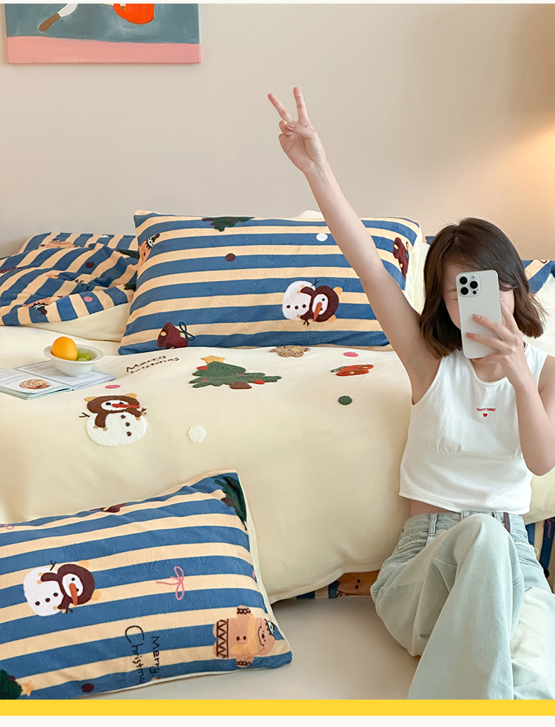 当前位置: 91家纺网 > 商品网购 > 床品套件 > 四件套 > 牛奶绒四件套 > 桃子家居 2025新款A类毛巾绣立体数码印花可爱卡通圣诞印加绣加厚牛奶绒系列四件套 绒印加绣-奶黄条纹雪人