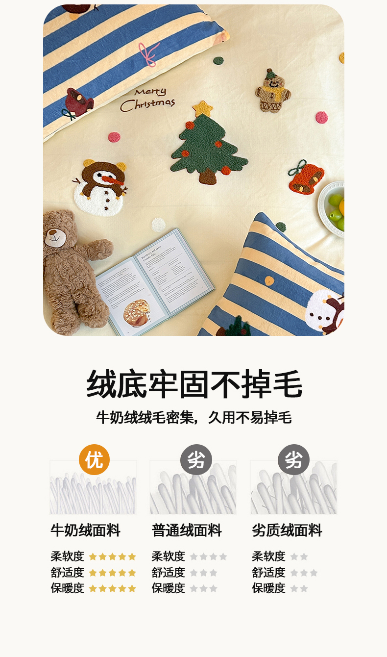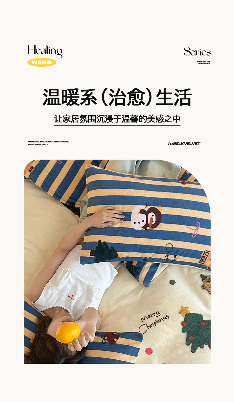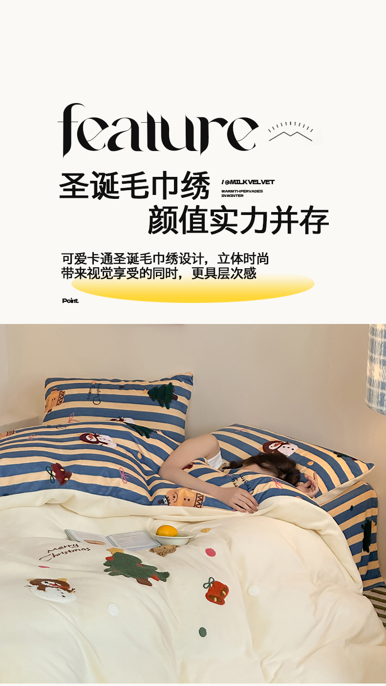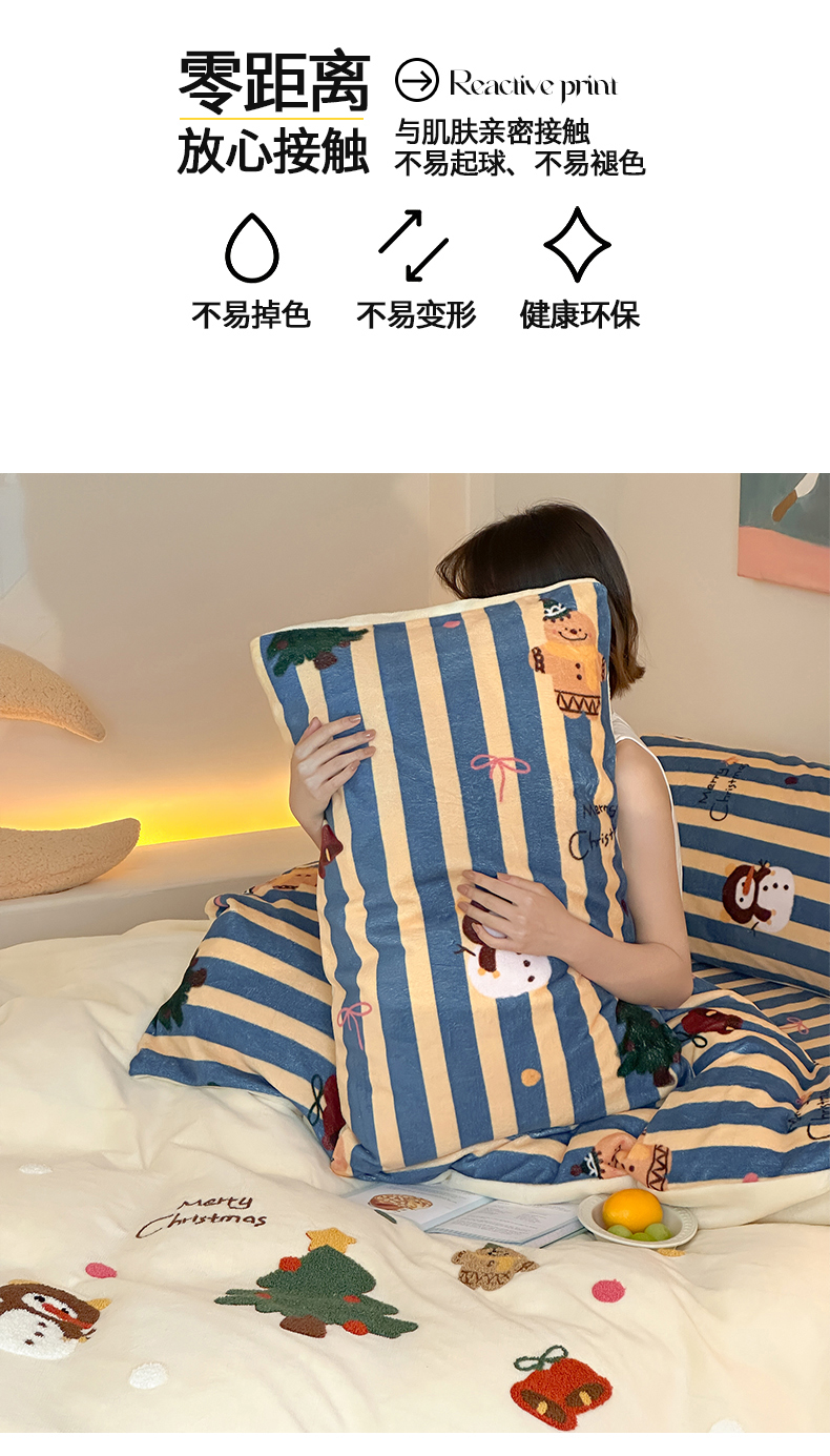 当前位置: 91家纺网 > 商品网购 > 床品套件 > 四件套 > 牛奶绒四件套 > 桃子家居 2025新款A类毛巾绣立体数码印花可爱卡通圣诞印加绣加厚牛奶绒系列四件套 绒印加绣-奶黄条纹雪人