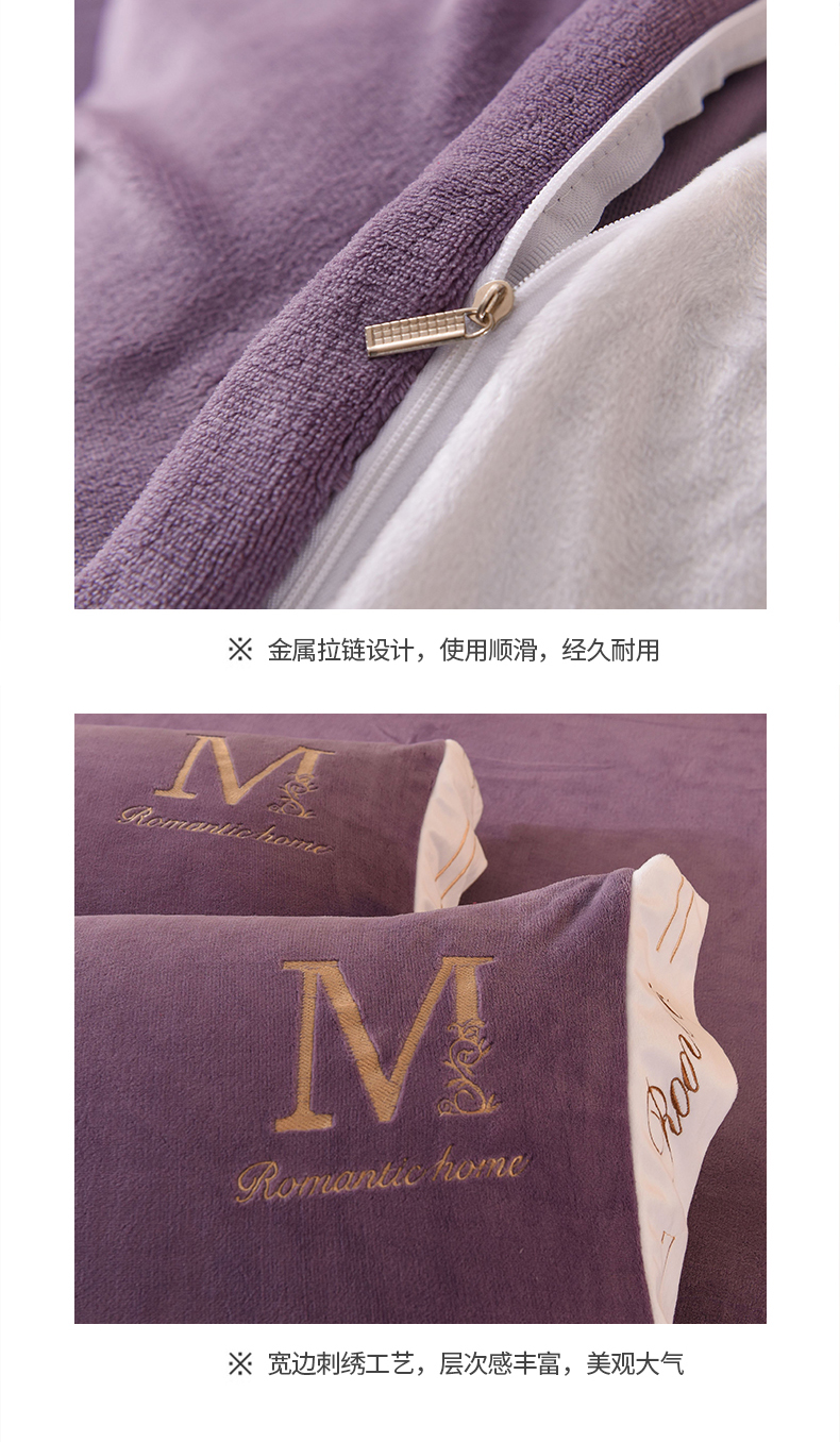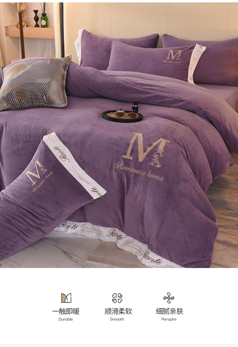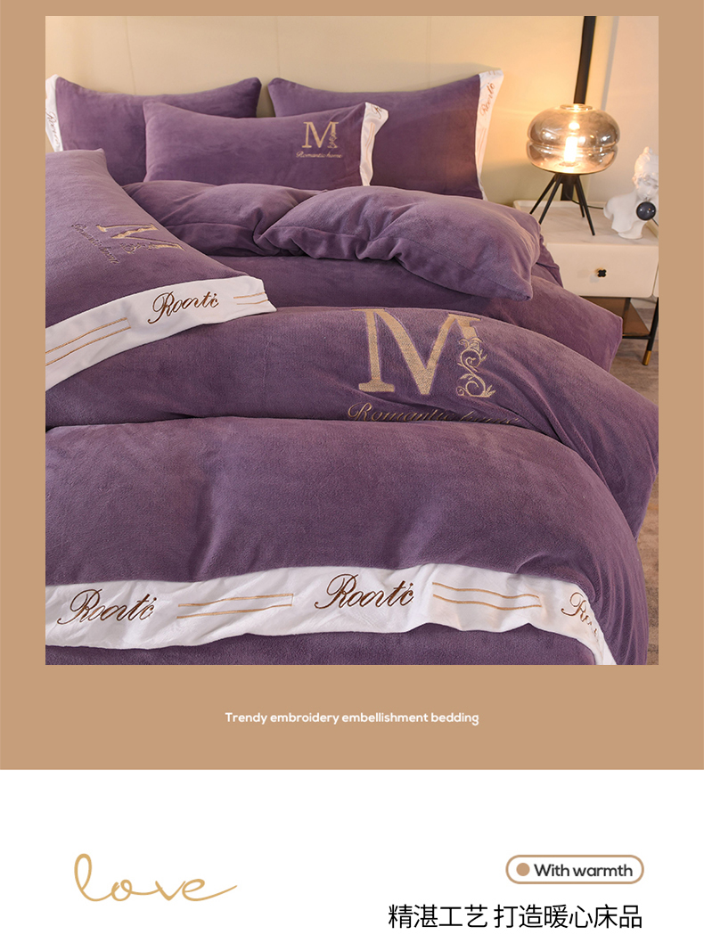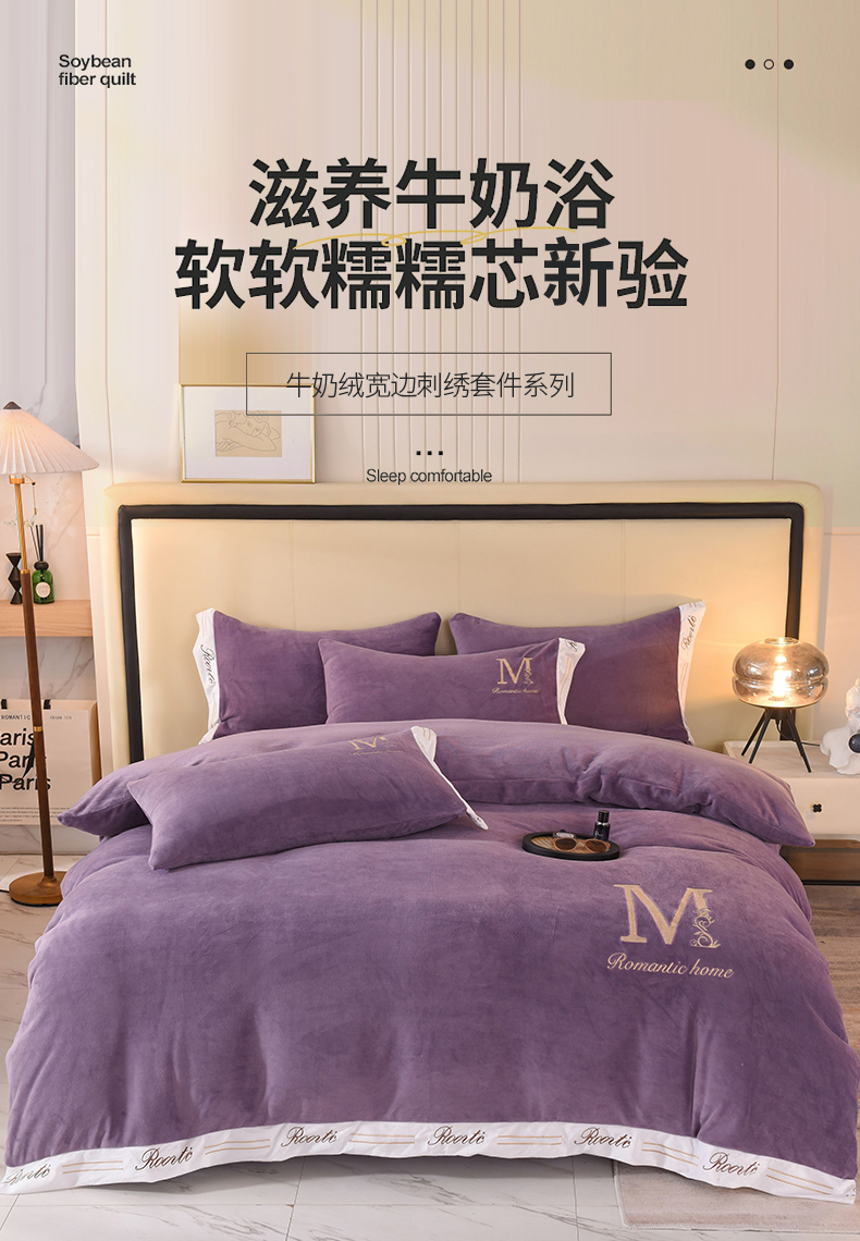 商品名称:大米家居 2025新款宽边刺绣牛奶绒四件套-罗曼蒂克系列 罗曼蒂克-暮山紫
