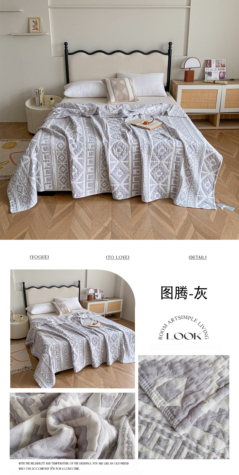 商品名称:卡奥家纺 2026新款水洗全棉纯棉四层纱盖毯毛巾被夏凉被夏被空调被-图腾系列 图腾-灰