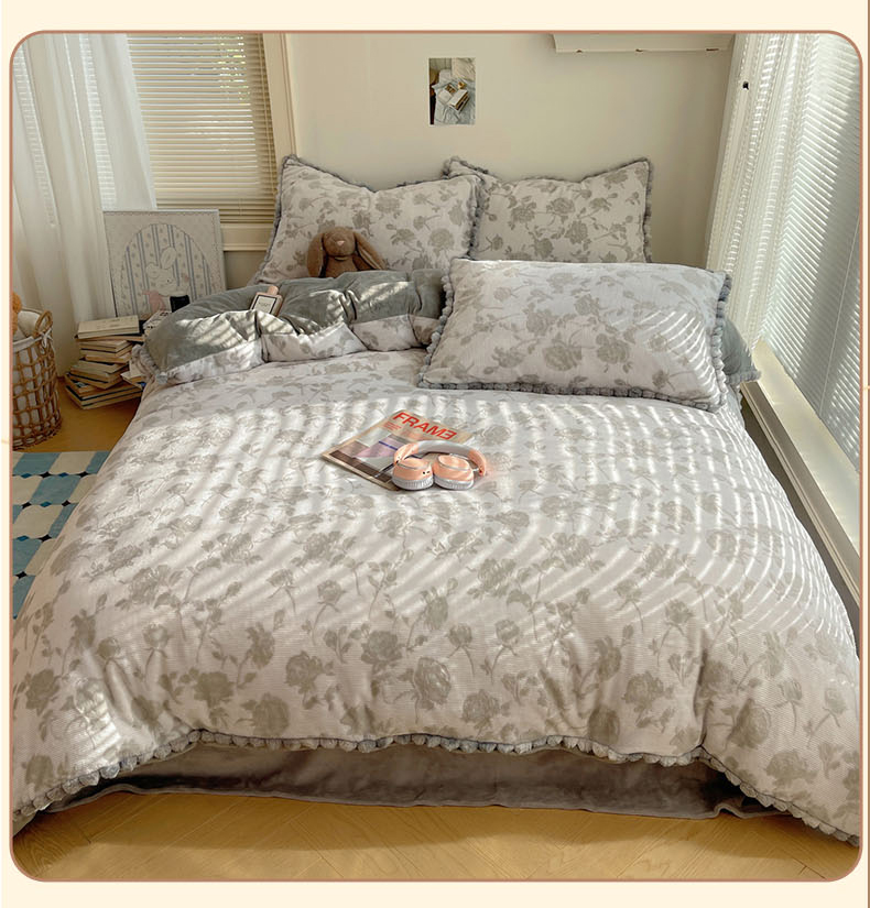 商品名称:(总)欣宜家纺 2025秋冬加绒加厚法式风兔毛球雕花牛奶绒四件套