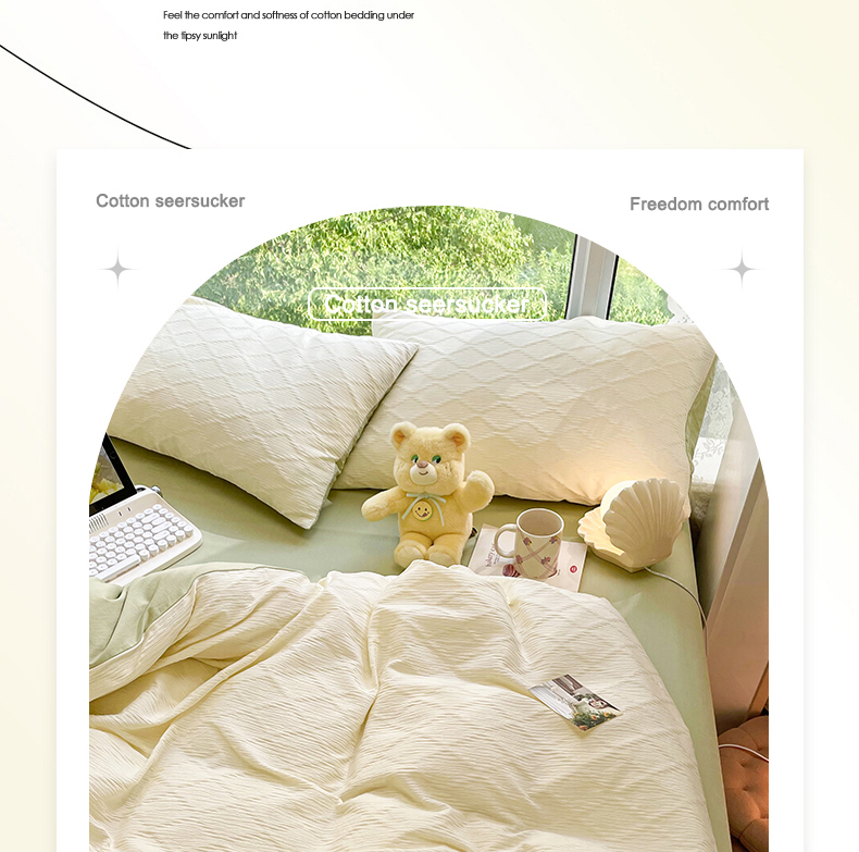 当前位置: 91家纺网 > 商品网购 > 床品套件 > 四件套 > 全棉普通四件套 > 琪格格纺织 2026新款纯棉色织肌理纹提花华夫格纯棉轻奢简约款四件套 泡泡纱米白奶绿