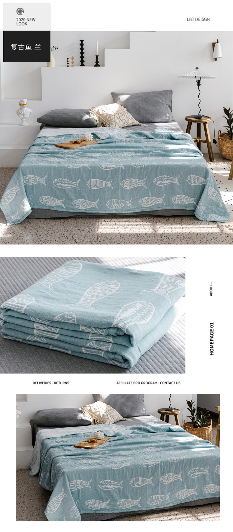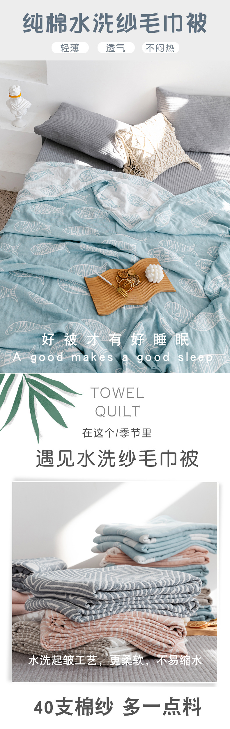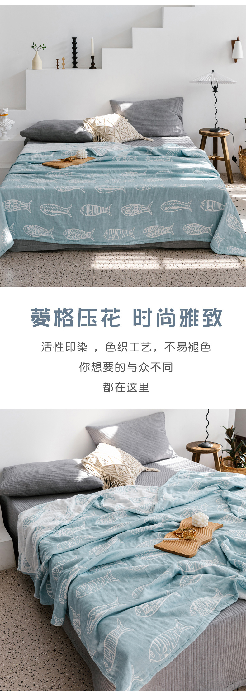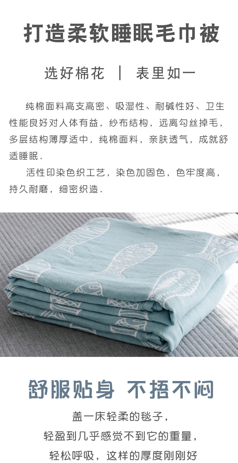 商品名称:朴尔家纺-毛巾被 2026春夏新款加厚三层水洗棉全棉纯棉纱布毛巾被夏被夏凉被空调被 复古鱼-兰