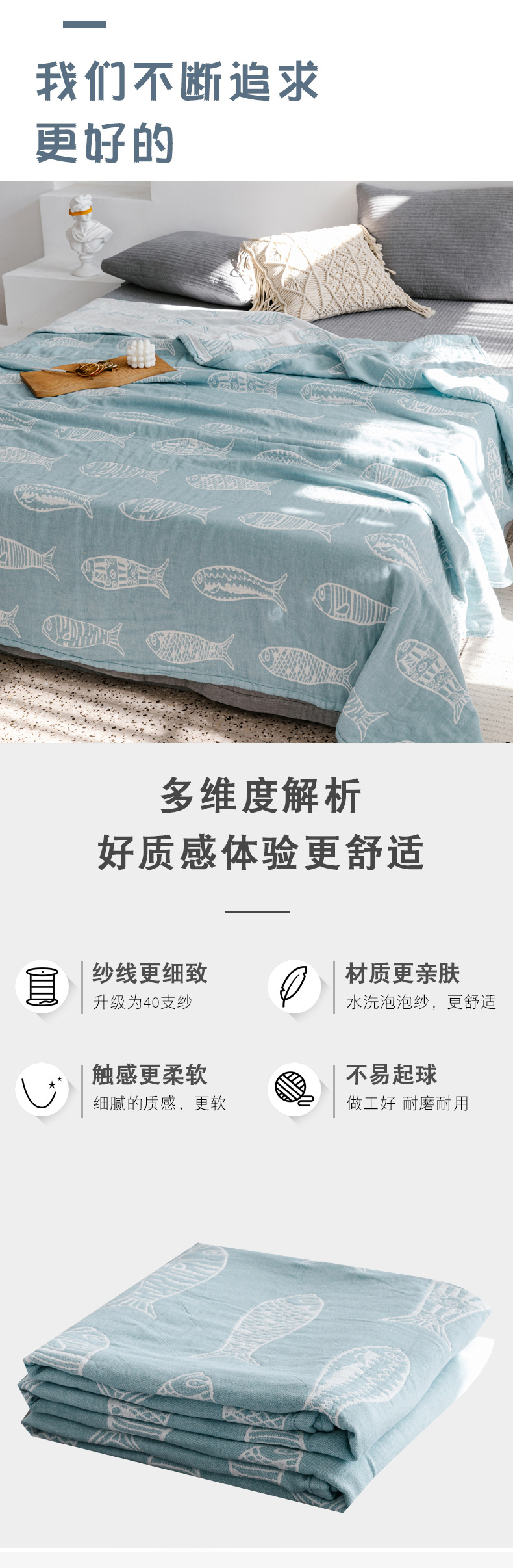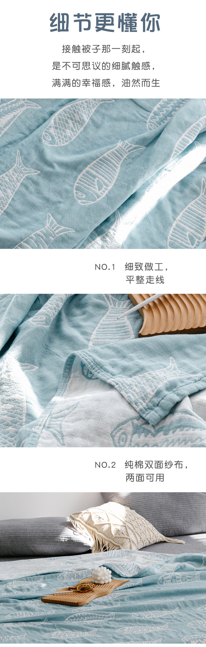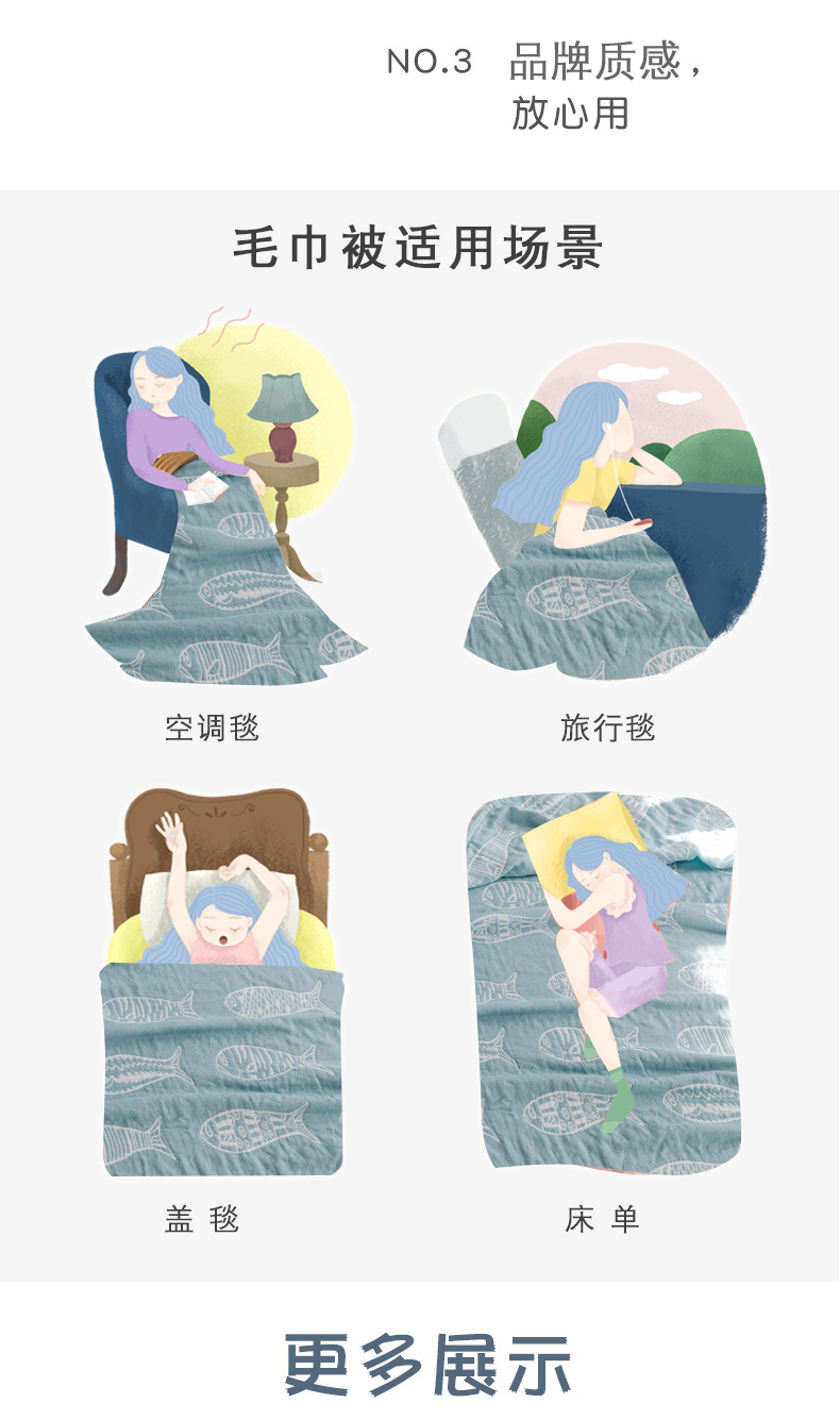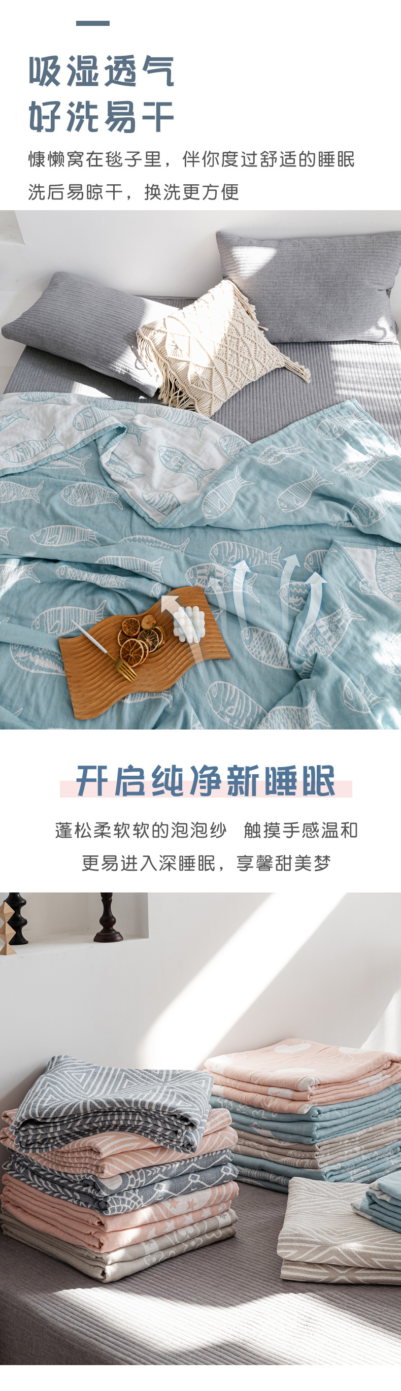 商品名称:朴尔家纺-毛巾被 2026春夏新款加厚三层水洗棉全棉纯棉纱布毛巾被夏被夏凉被空调被 复古鱼-兰