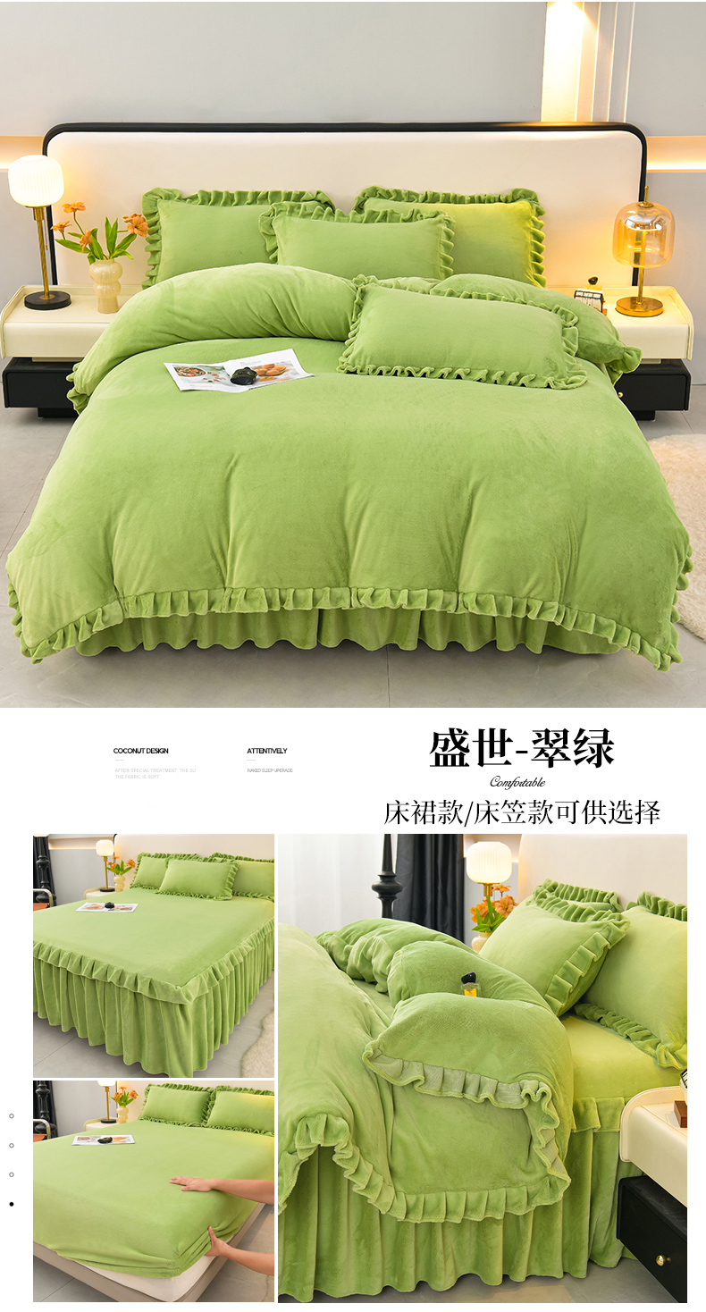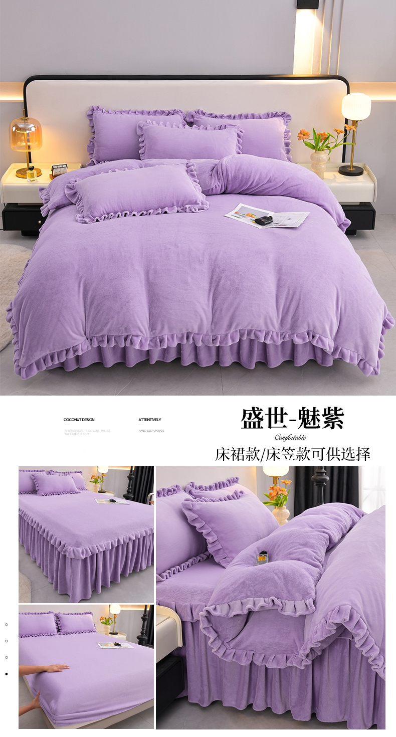 当前位置: 91家纺网 > 商品网购 > 床品套件 > 四件套 > 牛奶绒四件套 > 优家居工厂店 2026新款纯色韩版牛奶绒花边床裙床笠四件套单件被套直播爆款 盛世-银灰