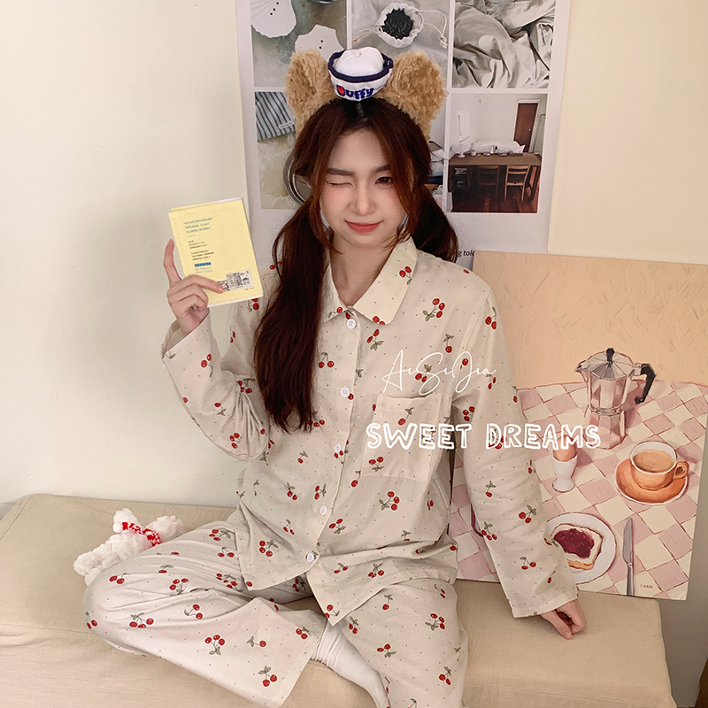 爱思佳 2026新款全棉双层纱长袖长裤睡衣 粉喵喵