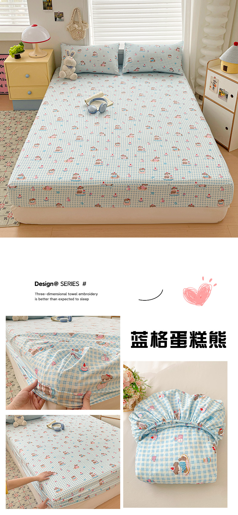 立森 2026春夏新款云感皱皱纱泡芙纱床笠单枕套系列-床拍图 蓝格蛋糕熊,蓝格蛋糕熊