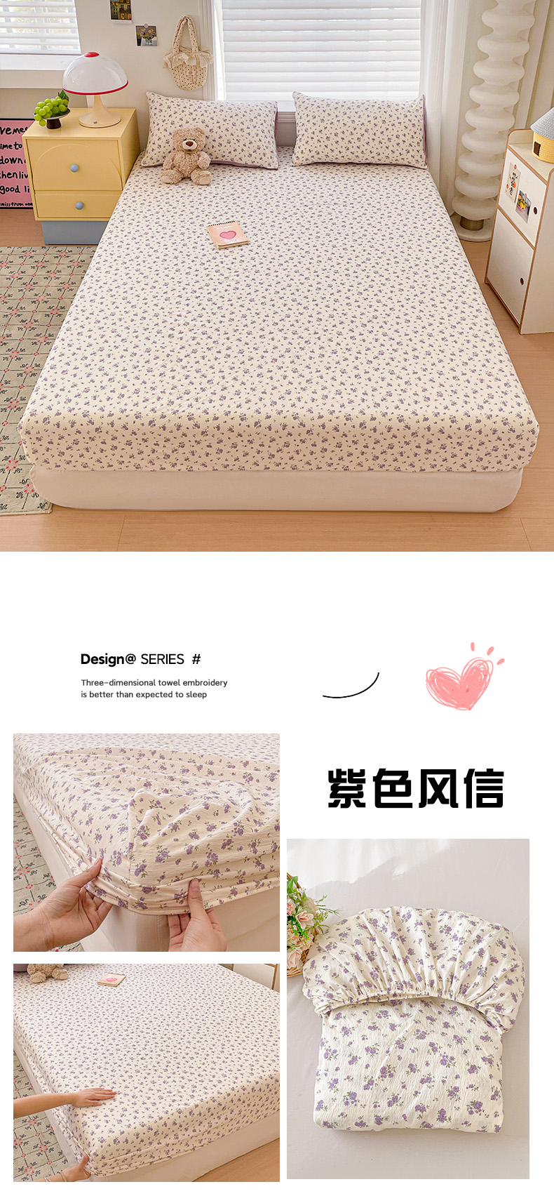 • 91家纺网 家纺一手货源 找家纺 立森 2026春夏新款云感皱皱纱泡芙纱床笠单枕套系列-床拍图 碎花萌宠,碎花萌宠