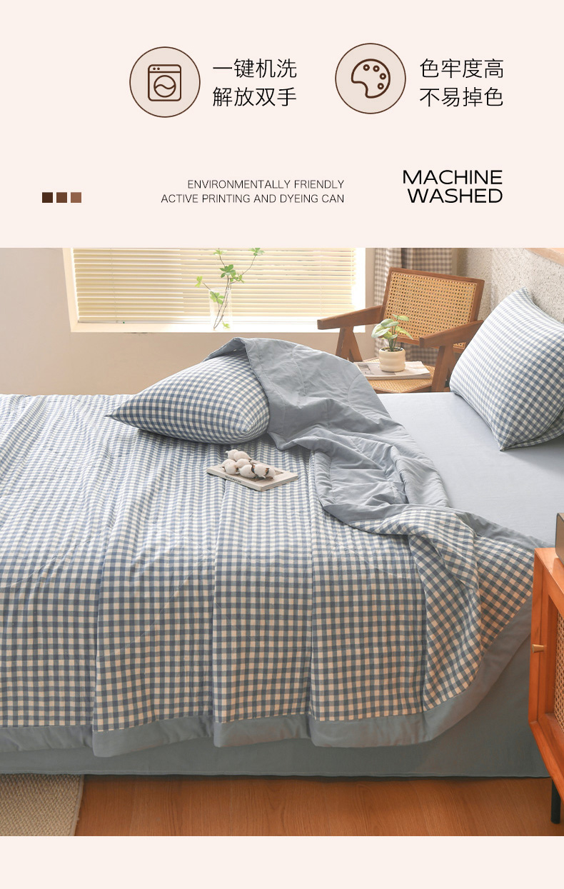 • 91家纺网 家纺一手货源 找家纺 培童家纺 2026新款全棉色织水洗棉A类棉花夏被可机洗空调被四件套床单枕套 蓝小格