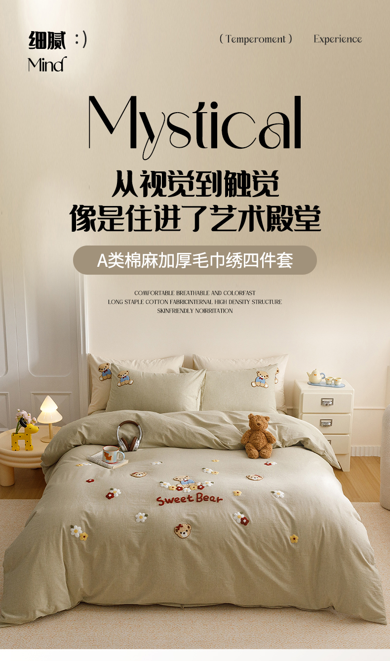 (总)艾莱家纺 2026春夏新款A类棉麻加厚四件套精艺刺绣精致毛巾绣四件套-冉初,冉初-本色,冉初-灰,冉初-绿,冉初-紫