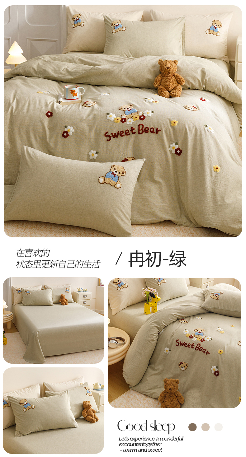 商品名称:艾莱家纺 2026春夏新款A类棉麻加厚四件套精艺刺绣精致毛巾绣四件套-冉初 冉初-绿