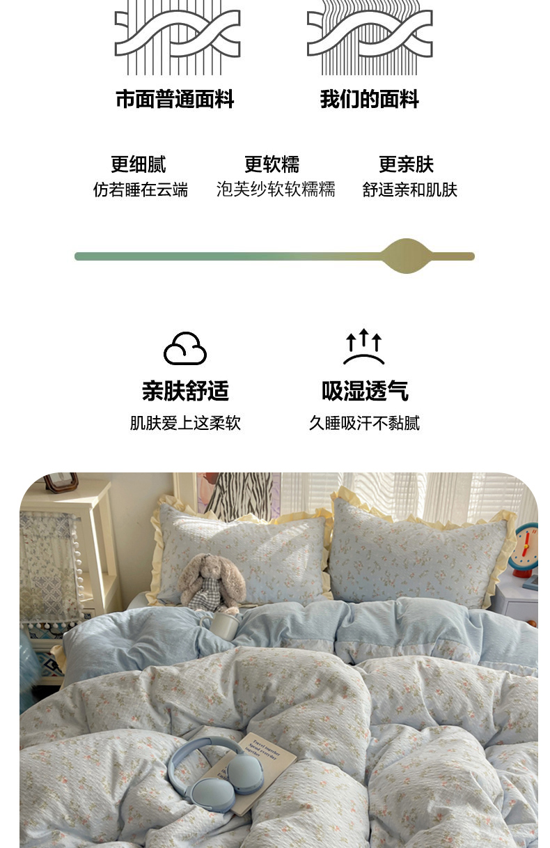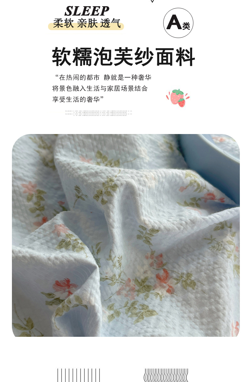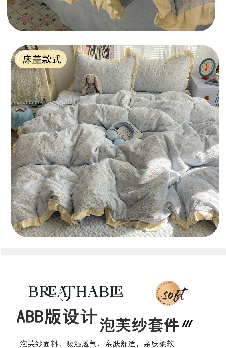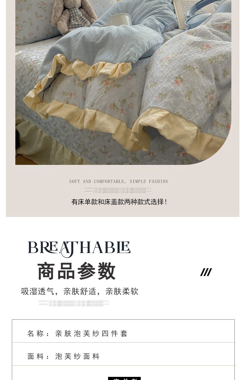 商品名称:迪梦姿家纺 2026新款高克重泡芙纱泡泡纱床盖款四件套系列 浅沙花影蓝