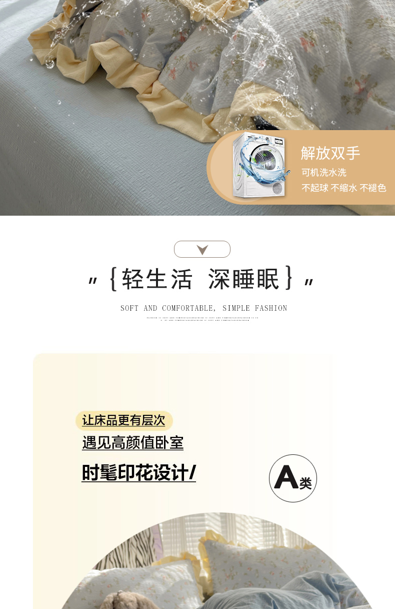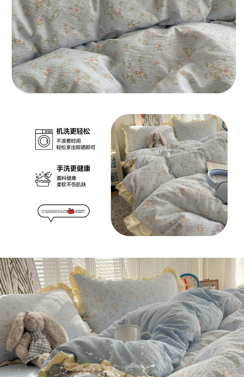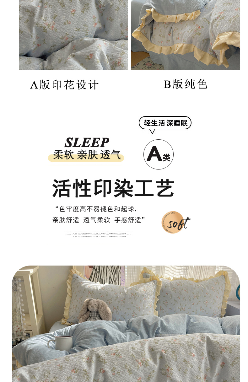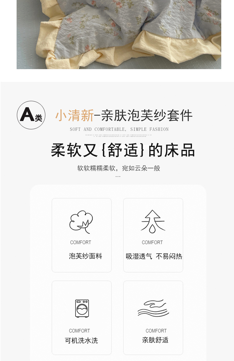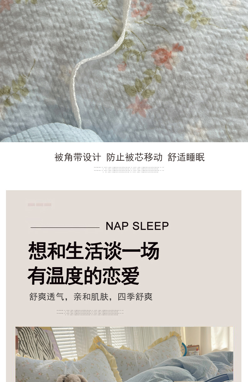 商品名称:迪梦姿家纺 2026新款高克重泡芙纱泡泡纱床盖款四件套系列 浅沙花影蓝