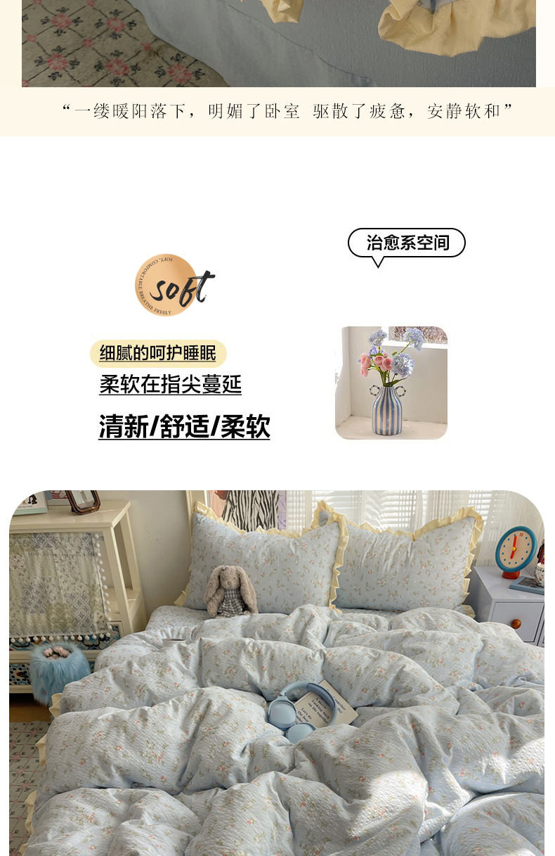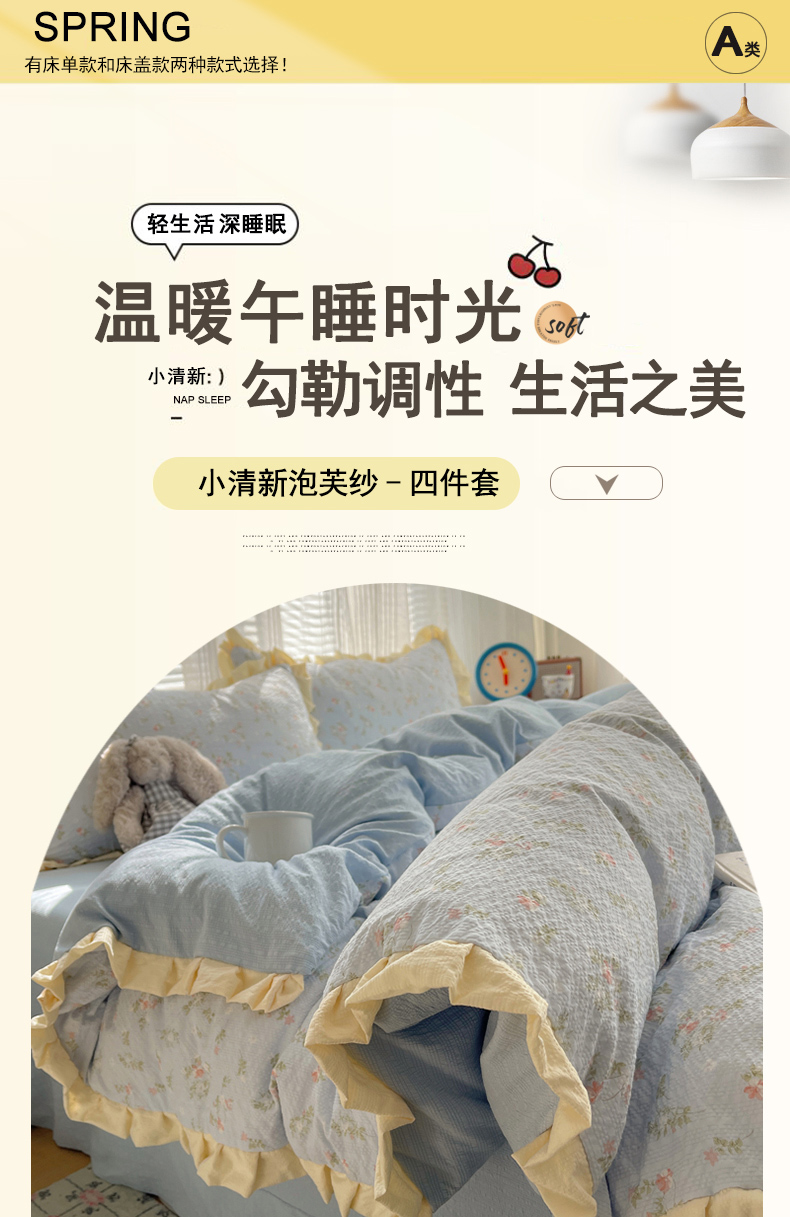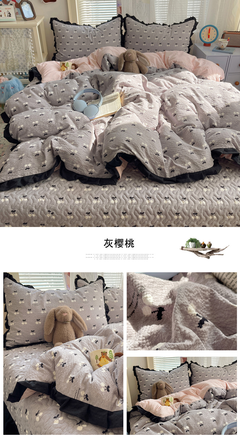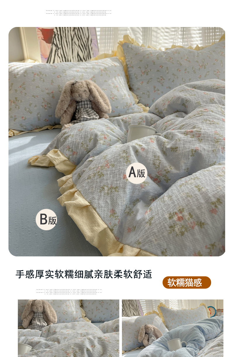 (总)迪梦姿家纺 2026新款高克重泡芙纱泡泡纱床盖款四件套系列,紫雾花蝶集,春日甜桃心米,纯宅熊,躲猫猫,花野兔眠,灰樱桃,旧街星星,猫咪集粉,莓系花伐,描线小猫咖,木马小花团,浅沙花影黄,浅沙花影蓝,田园兔,甜喵块块,甜心咖絮,甜心木马卷,兔仔花田,小兔裙边,星野蝴蝶结,悦悦小兔,只闻花香