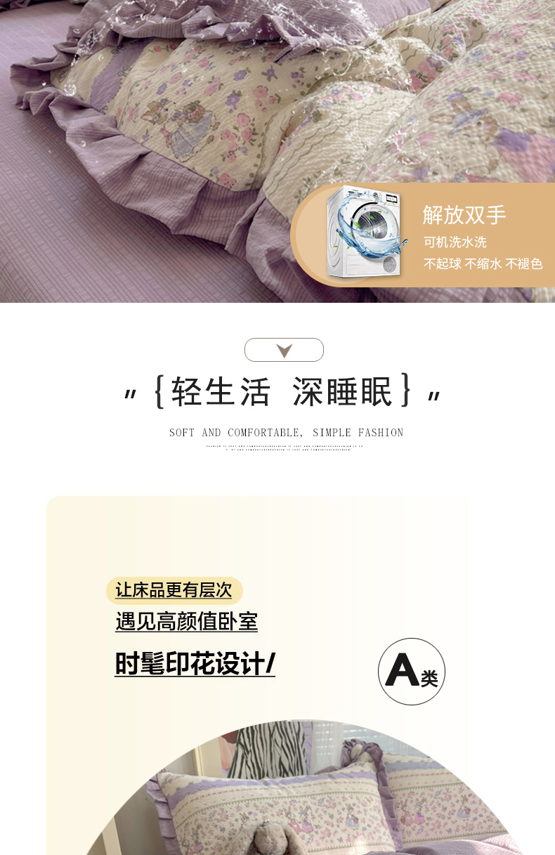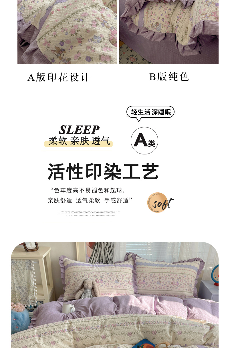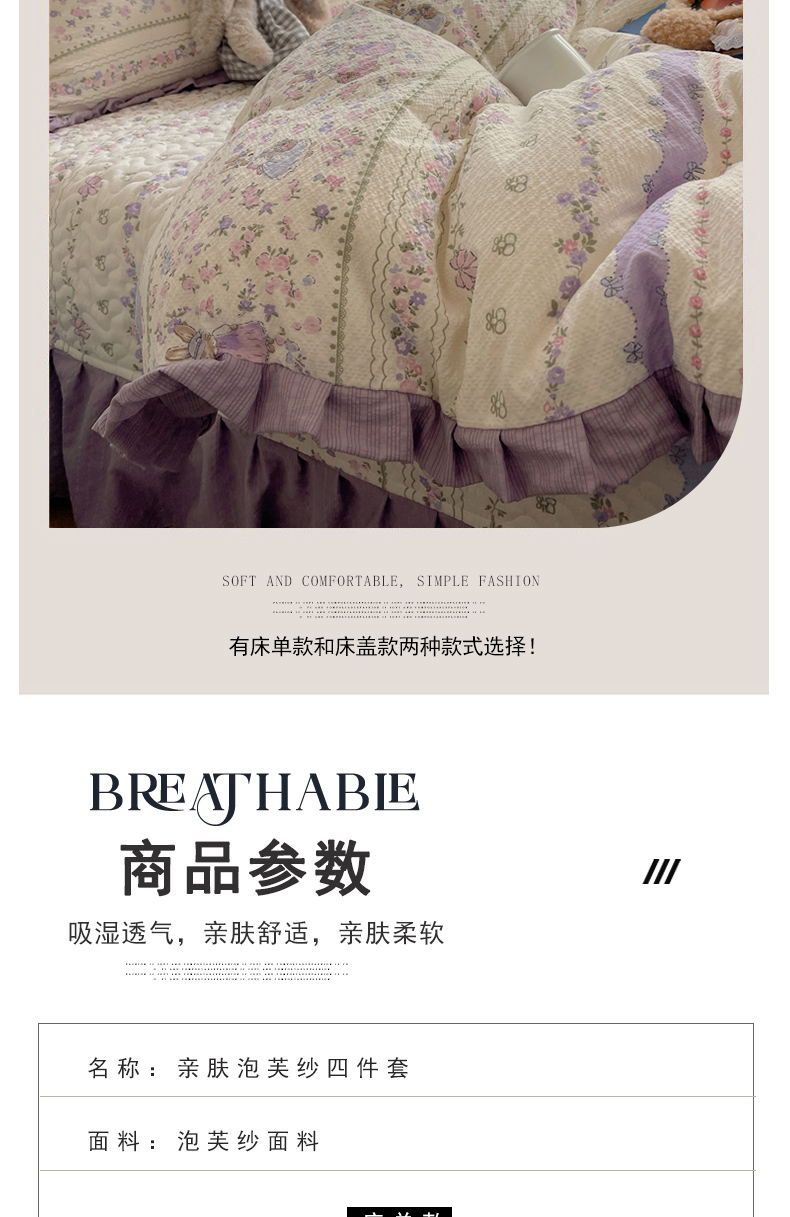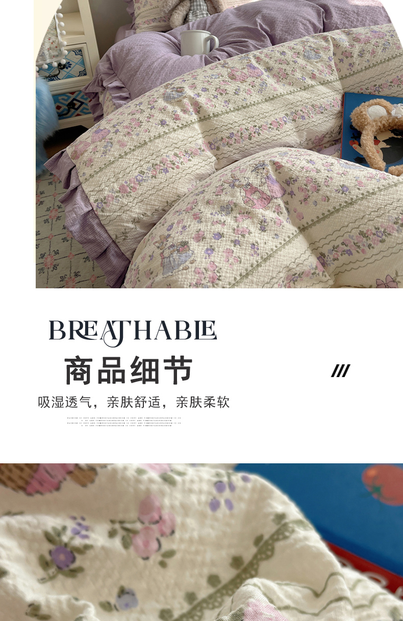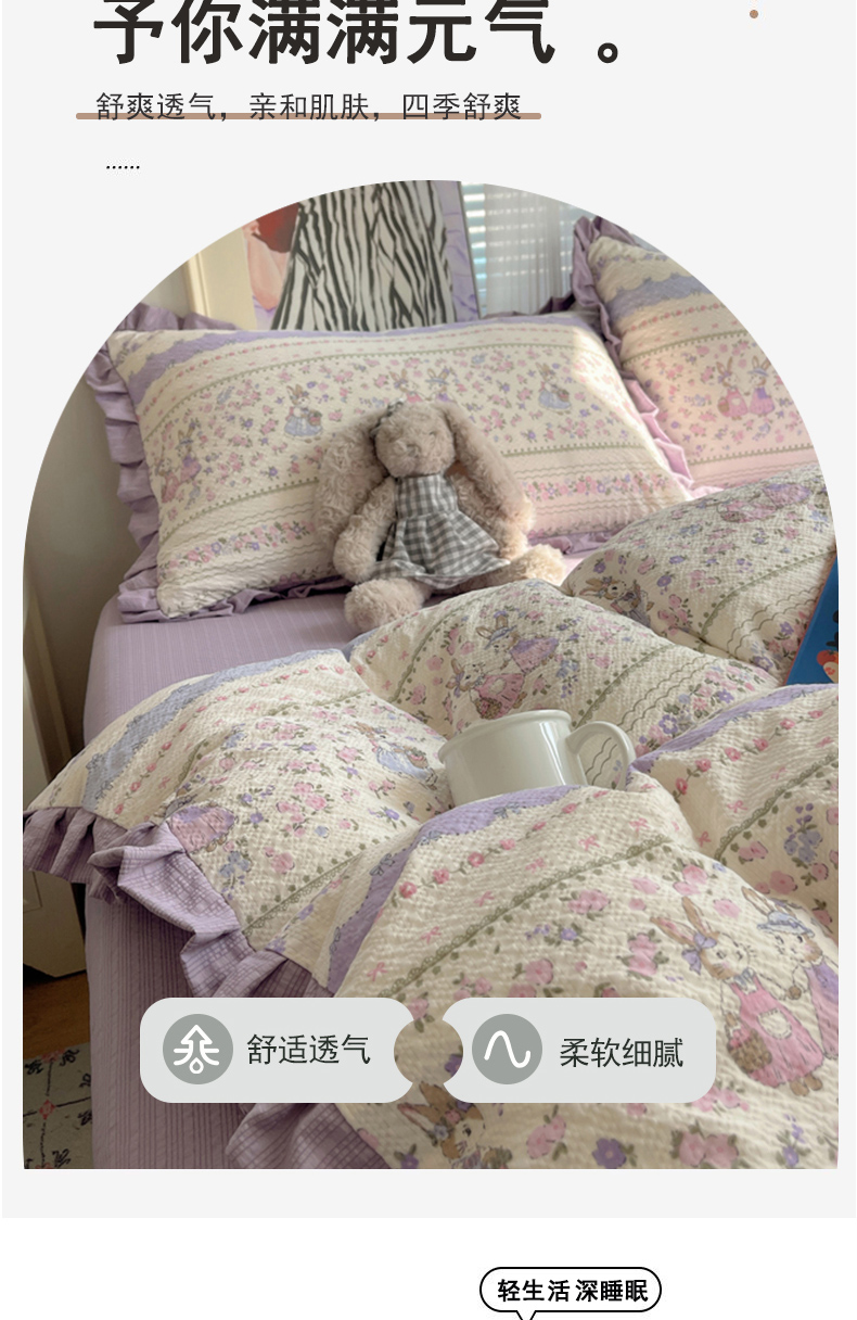 商品名称:迪梦姿家纺 2026新款高克重泡芙纱泡泡纱床单款四件套系列 小兔裙边