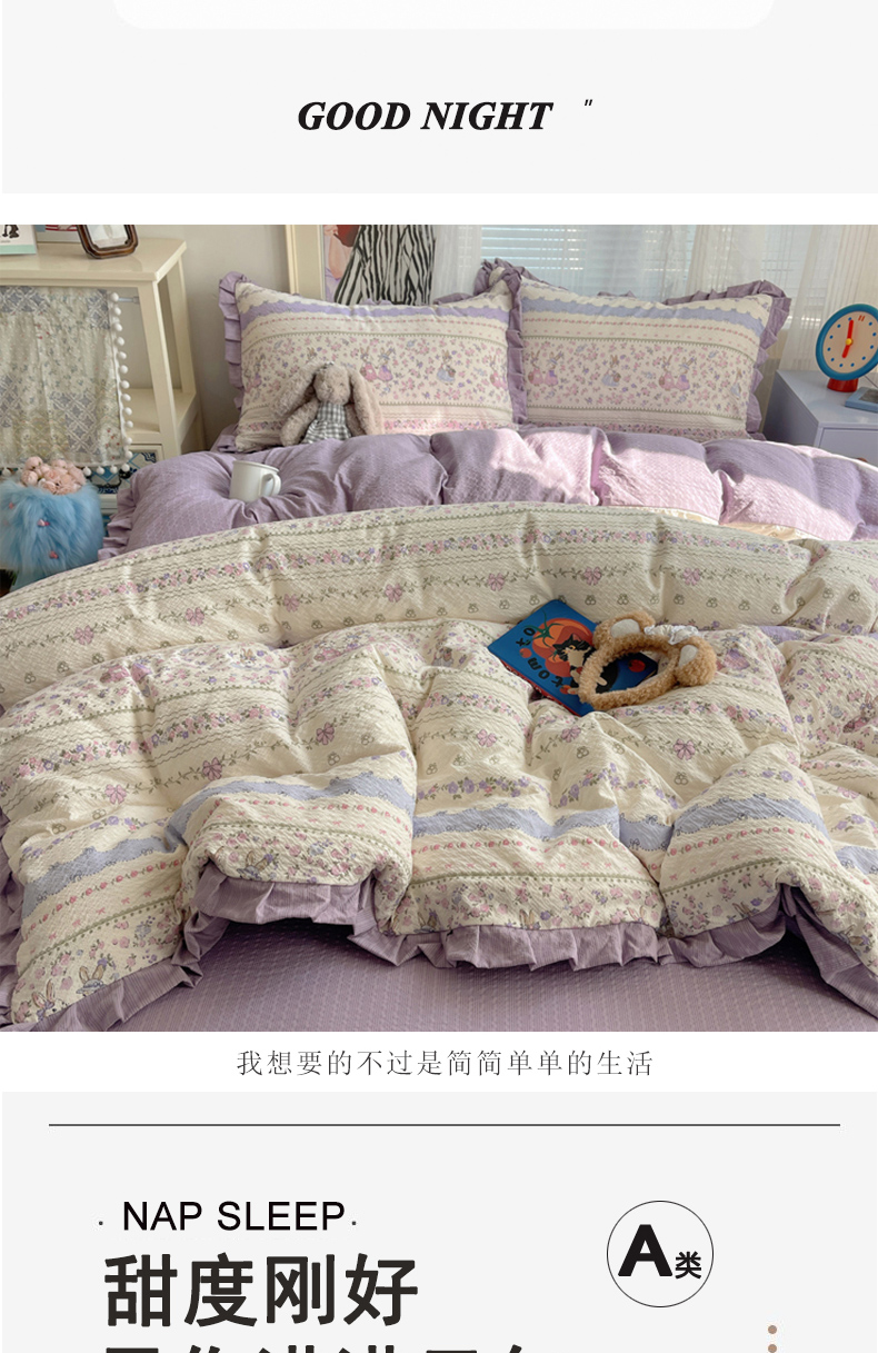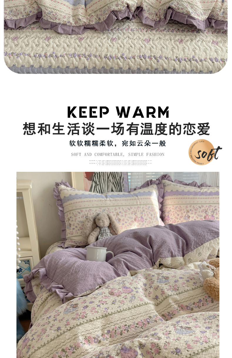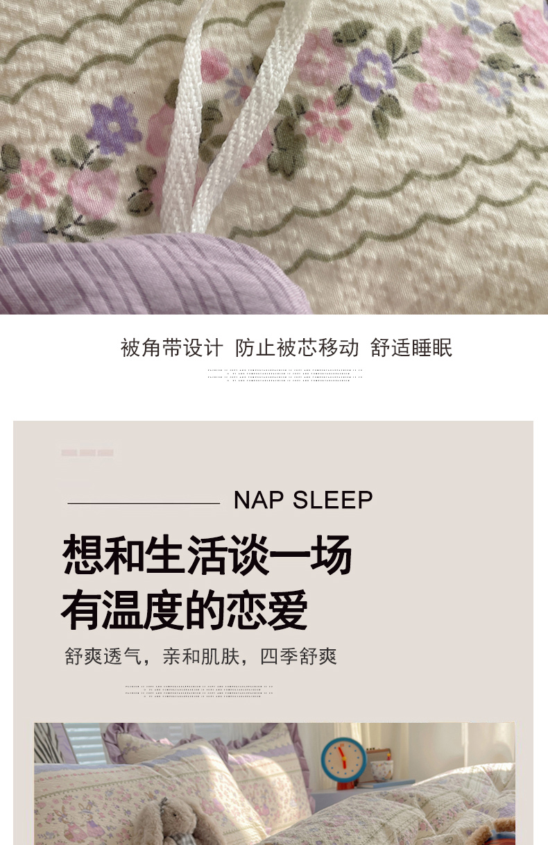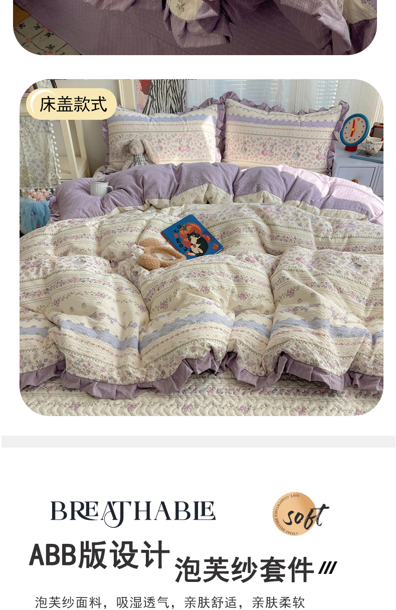 (总)迪梦姿家纺 2026新款高克重泡芙纱泡泡纱床盖款四件套系列,紫雾花蝶集,春日甜桃心米,纯宅熊,躲猫猫,花野兔眠,灰樱桃,旧街星星,猫咪集粉,莓系花伐,描线小猫咖,木马小花团,浅沙花影黄,浅沙花影蓝,田园兔,甜喵块块,甜心咖絮,甜心木马卷,兔仔花田,小兔裙边,星野蝴蝶结,悦悦小兔,只闻花香
