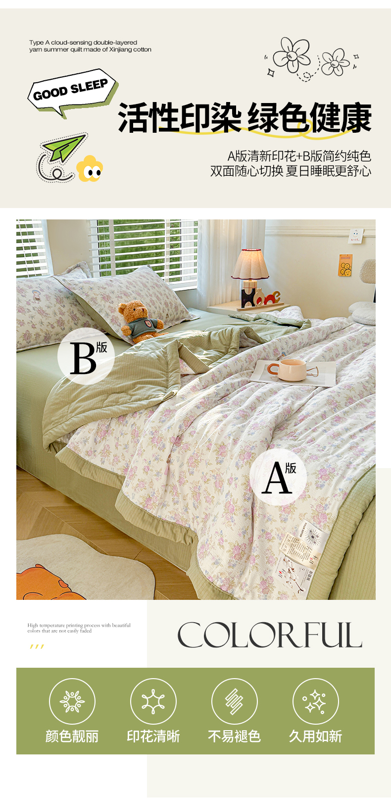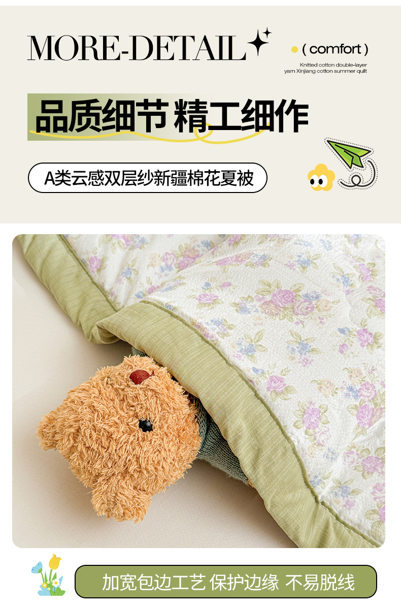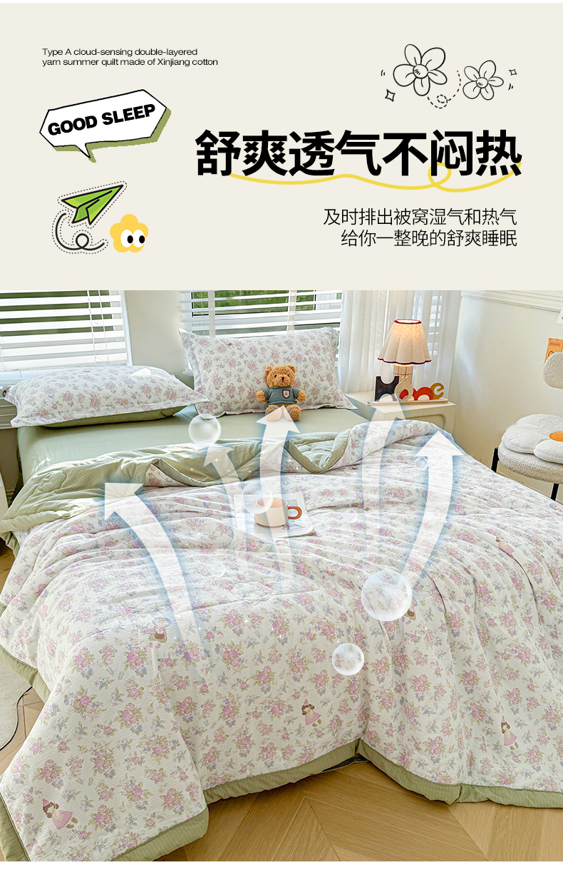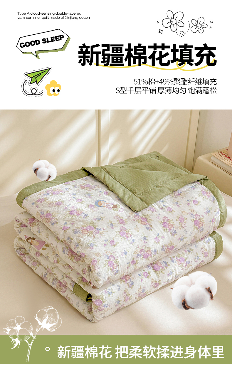 商品名称:2026新款A类新疆棉花夏凉被加宽包边水洗棉卡通印花吸湿透气棉花夏被空调被 云感花梦女孩