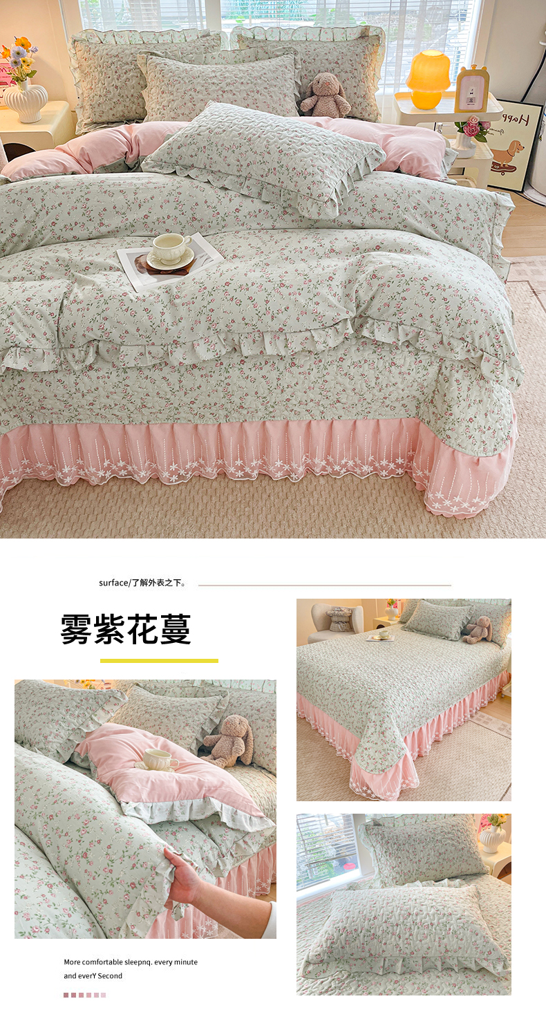 当前位置: 91家纺网 > 商品网购 > 床品套件 > 四件套 > 其它四件套 > 艺慕家纺 2026新款直播热款古法仿棉水洗棉印花双层蕾丝花边床盖四件套 雾紫花蔓