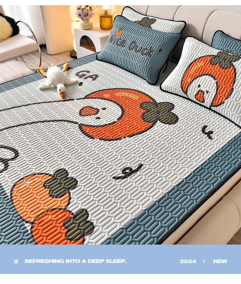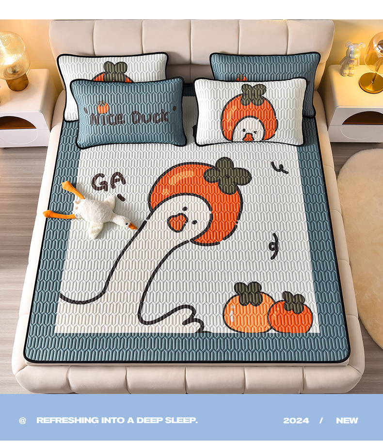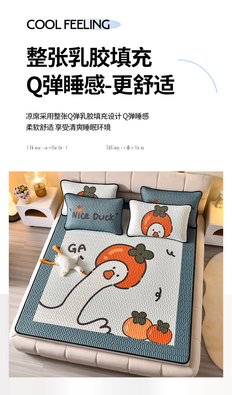 炫拼家纺 2026新款凉感丝大版卡通乳胶凉席三件套 好柿鸭