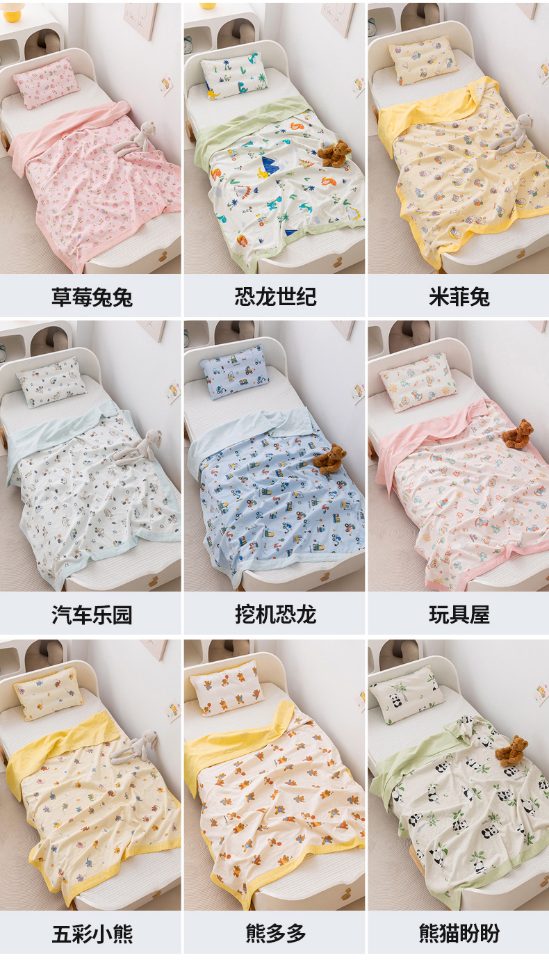 (总)嗨生活 2026新款7A抗菌全棉纱布夏被儿童夏被幼儿园夏被夏被毯,熊猫盼盼,草莓兔兔,呆萌小熊,格子兔,欢乐时光,恐龙世纪,萌萌小兔,奶牛小狗,汽车乐园,汽车小分队,狮子王国,挖机恐龙,玩具屋,组合图